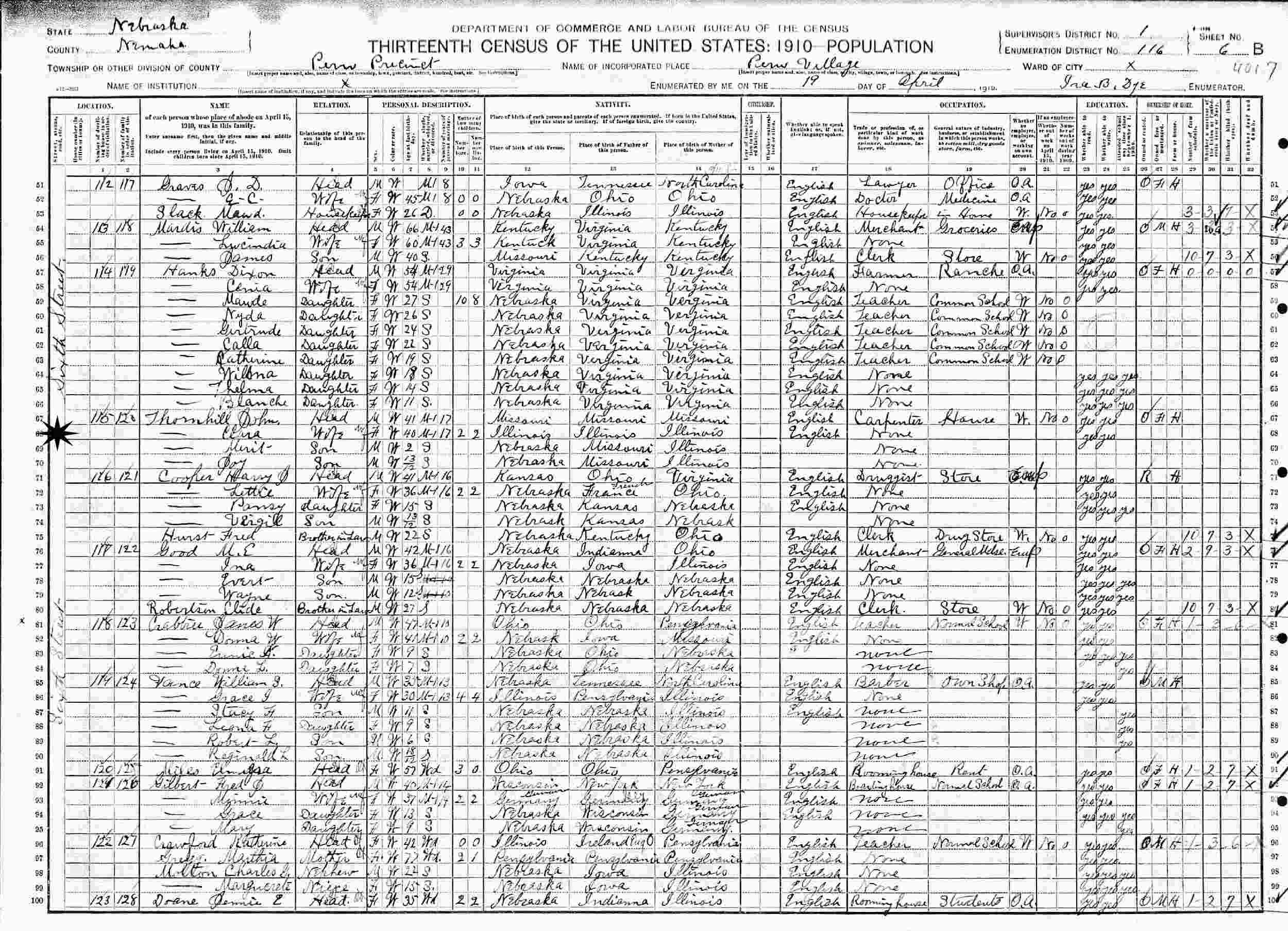 April 19, 1910 - Sixth Street, Supervisor's District 1, Enumeration District 116, Peru Precinct, Peru Village, Nemaha County, Nebraska.