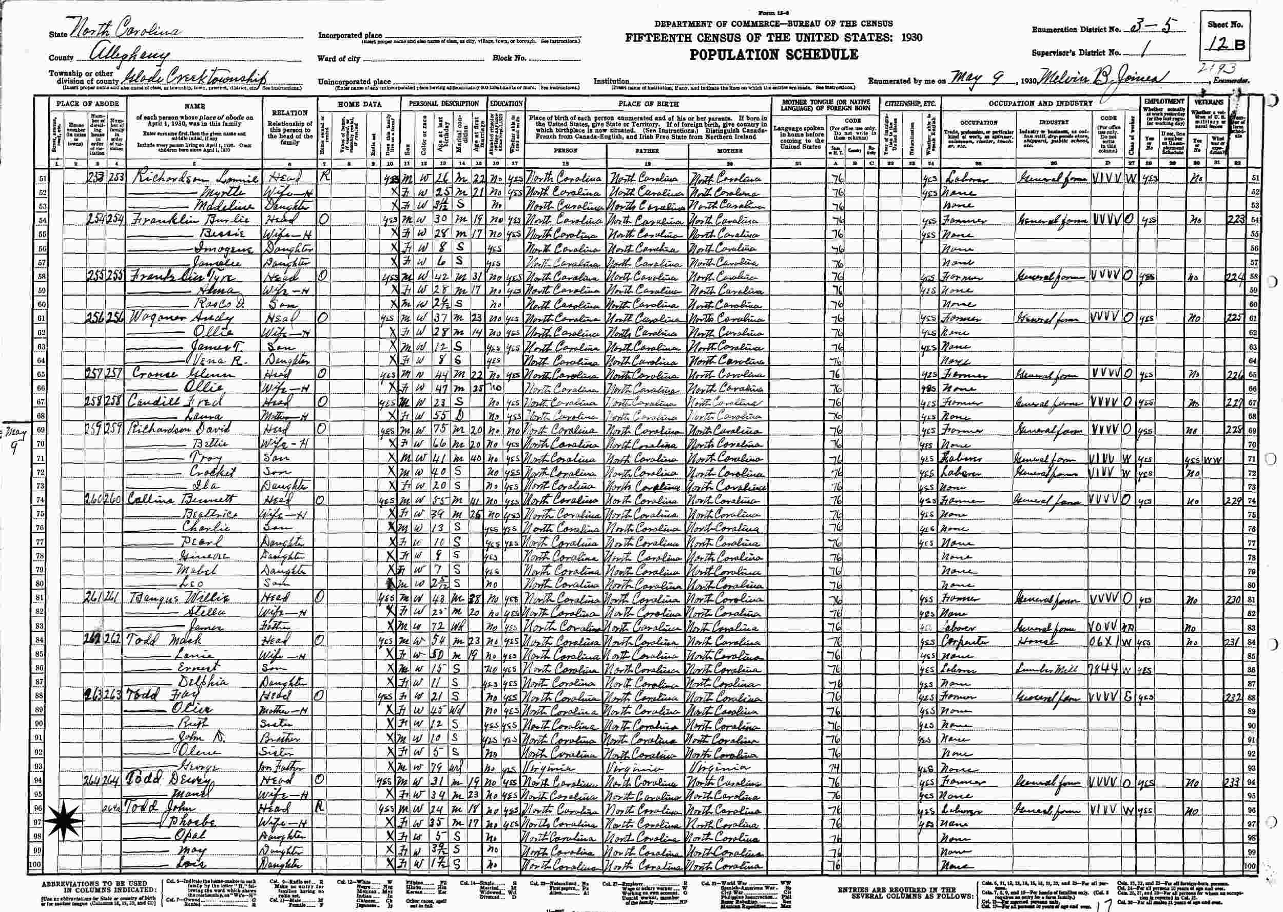 May 9, 1930 - Supervisor's District 1, Enumeration District 3-5, Glade Creek Township, Alleghany County, North Carolina.