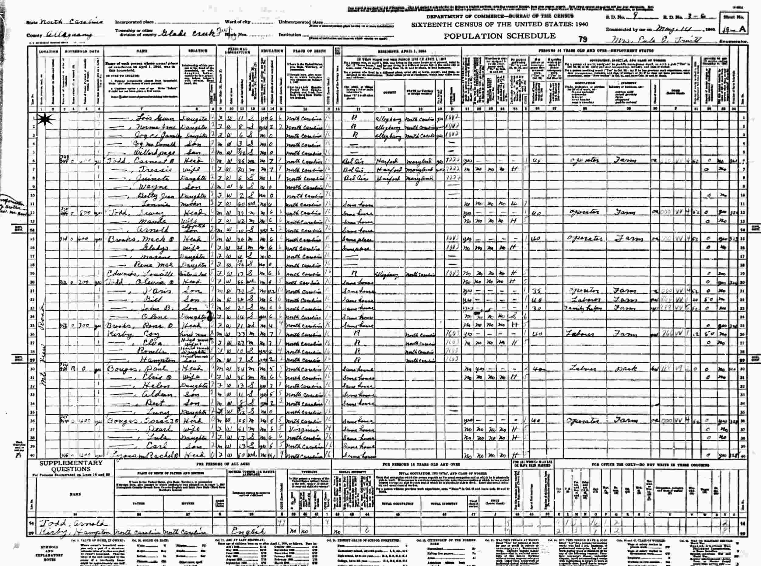 May 14, 1940 - Glade Creek Township, Supervisor's District 9, Enumeration District 3-6, Alleghany County, North Carolina.