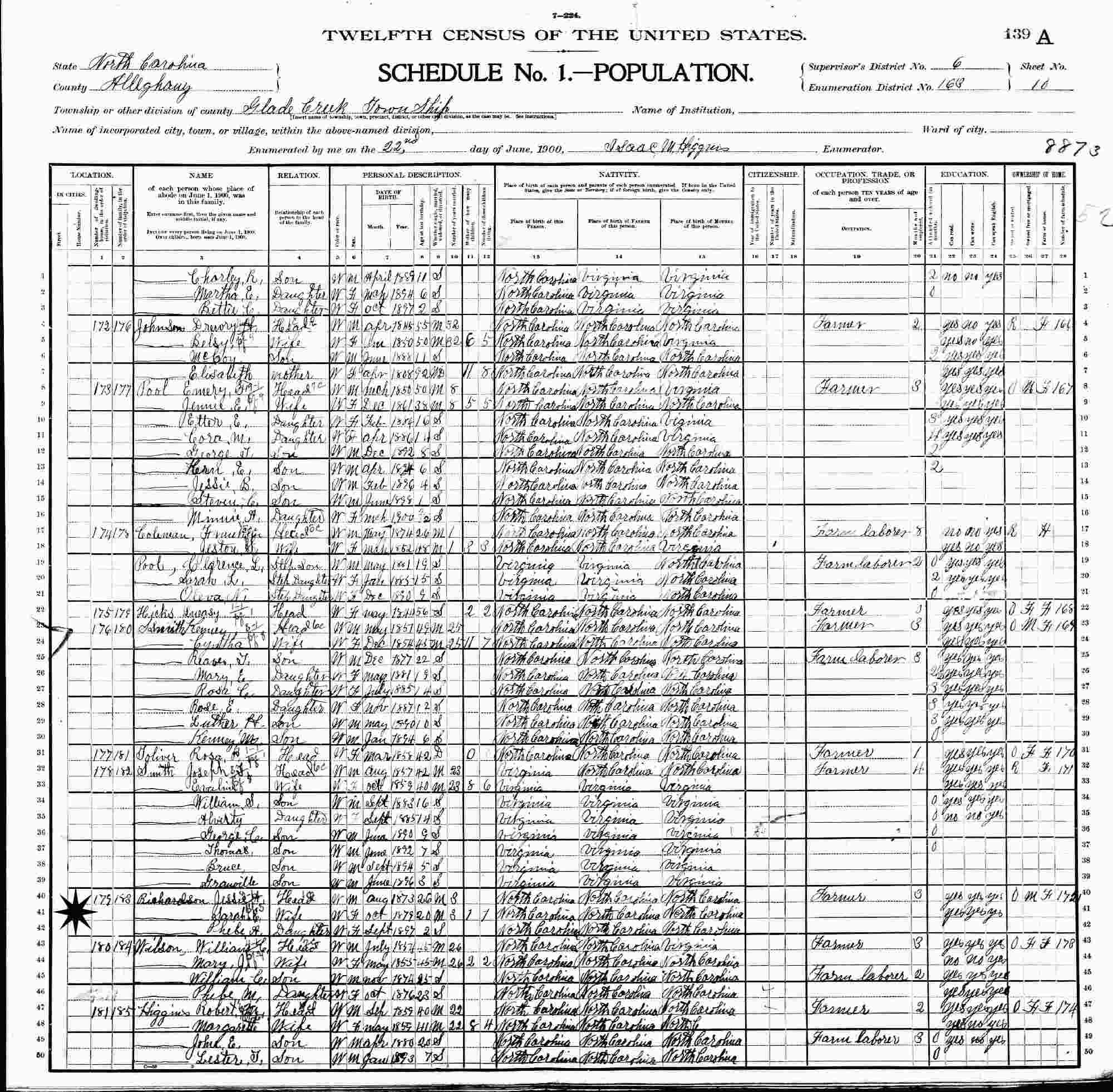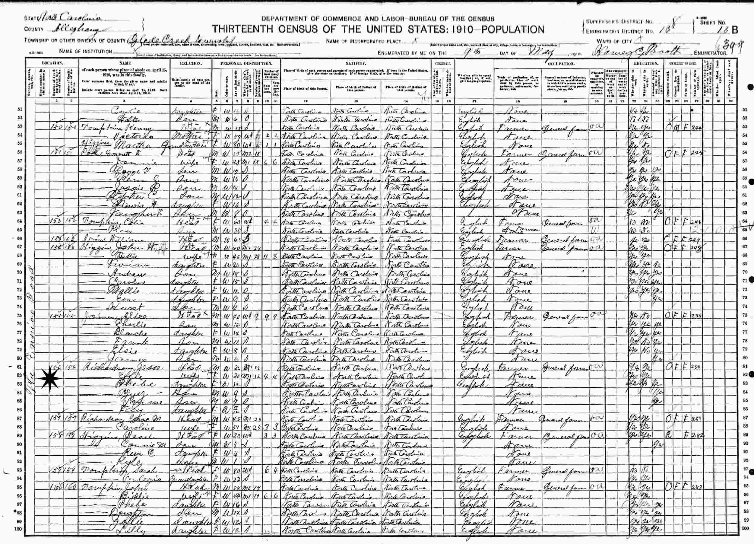 April 29, 1910 - The Rich Hill Road, Supervisor's District 8, Enumeration District 13, Glade Creek, Alleghany County, North Carolina.