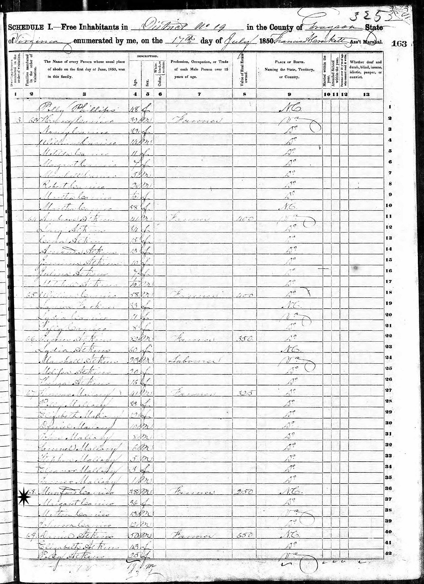 July 17, 1850 - District 19, Grayson County, Virginia.