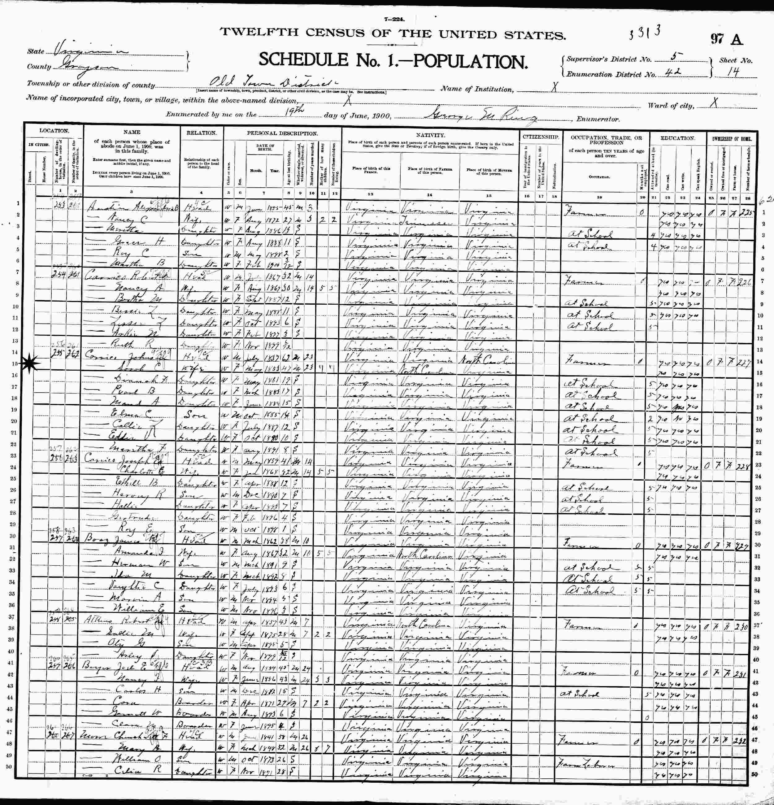 June 19, 1900 - Old Town District, Supervisor's District 5, Enumeration District 42, Grayson County, Virginia.