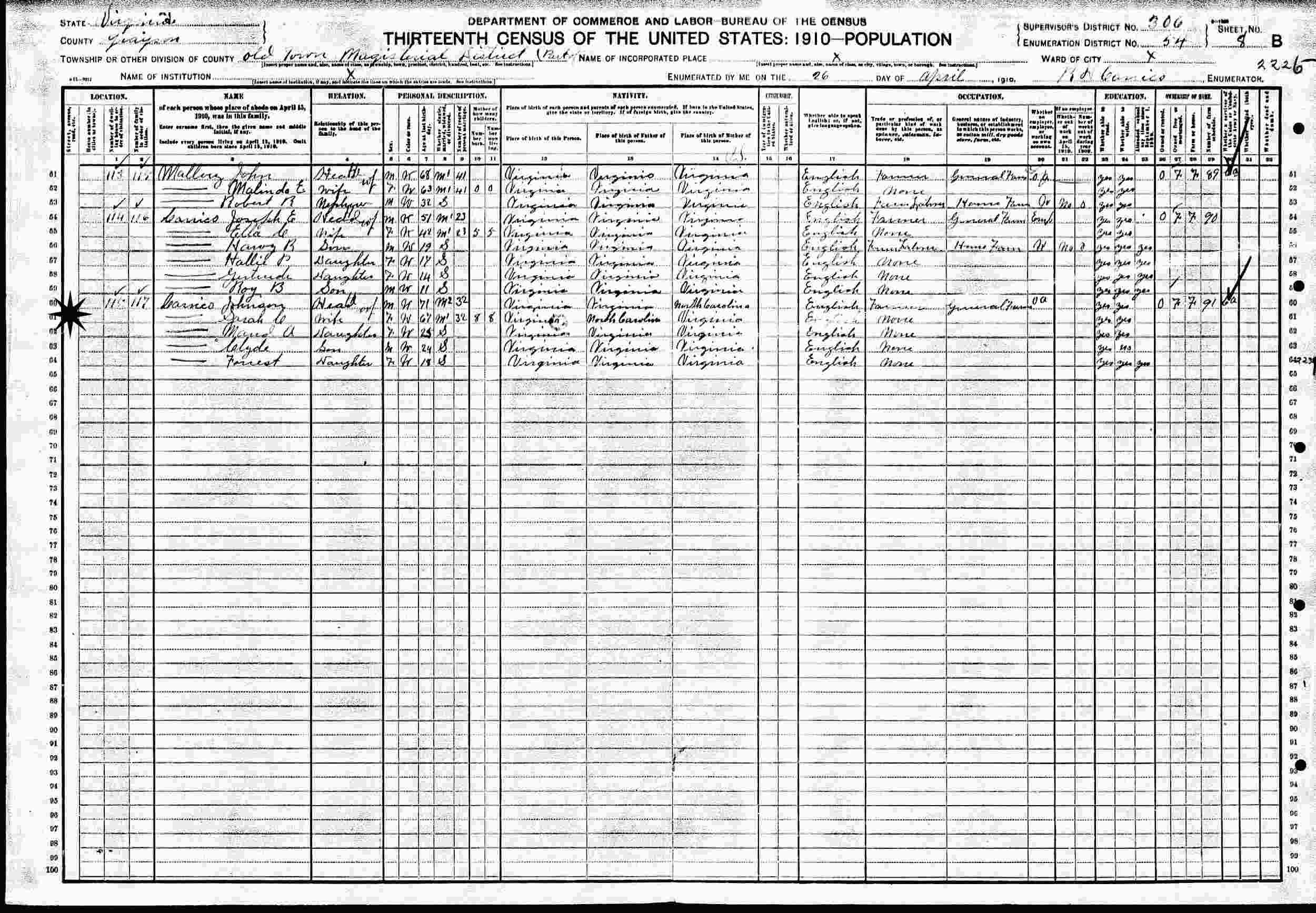 April 26, 1910 - Old Town Magisterial District, Supervisor's District 306, Enumeration District 54, Grayson County, Virginia.