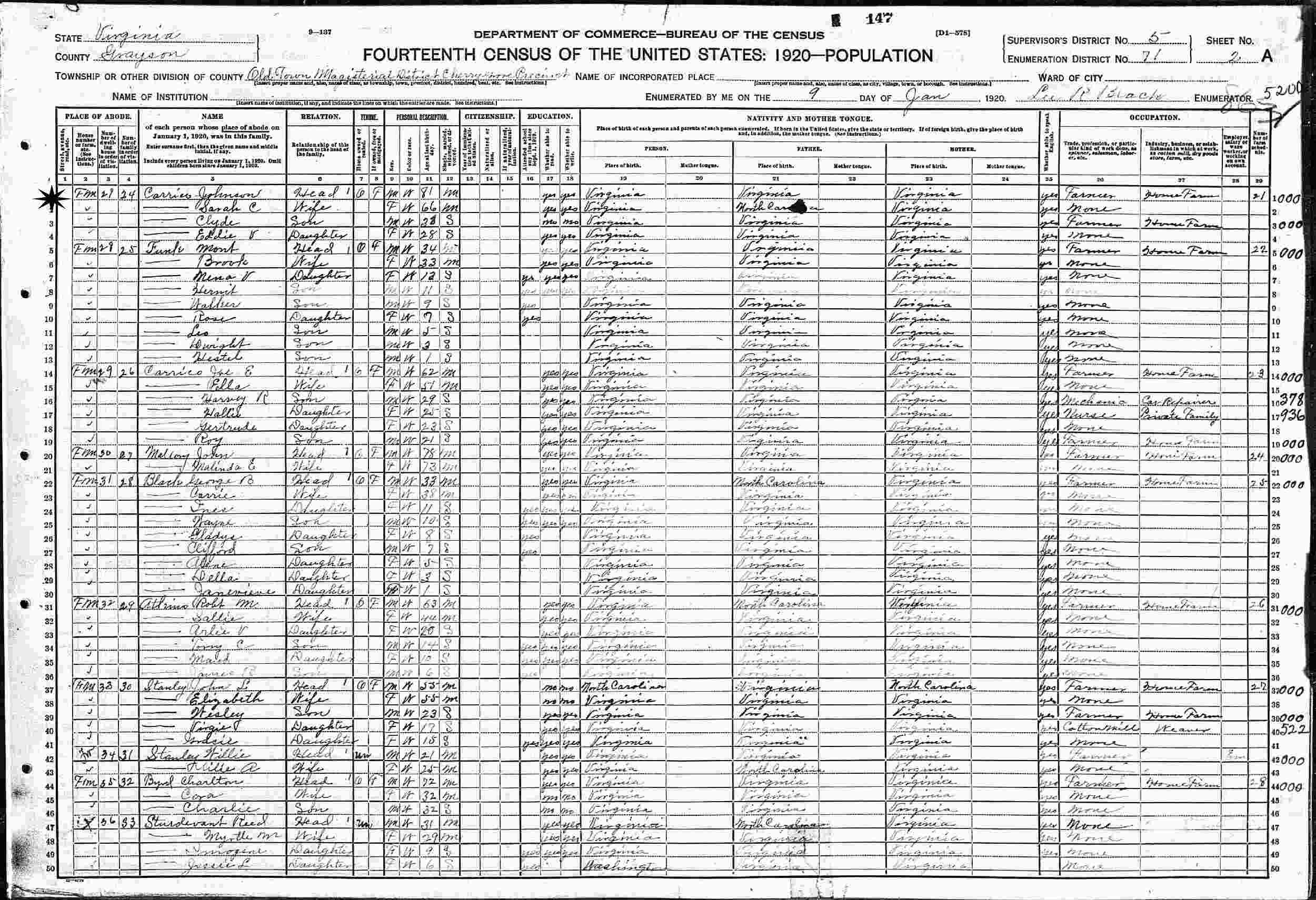 January 9, 1920 - Old Town Magisterial District, Cherry Grove Precinct, Supervisor's District 5, Enumeration District 71, Grayson County, Virginia.