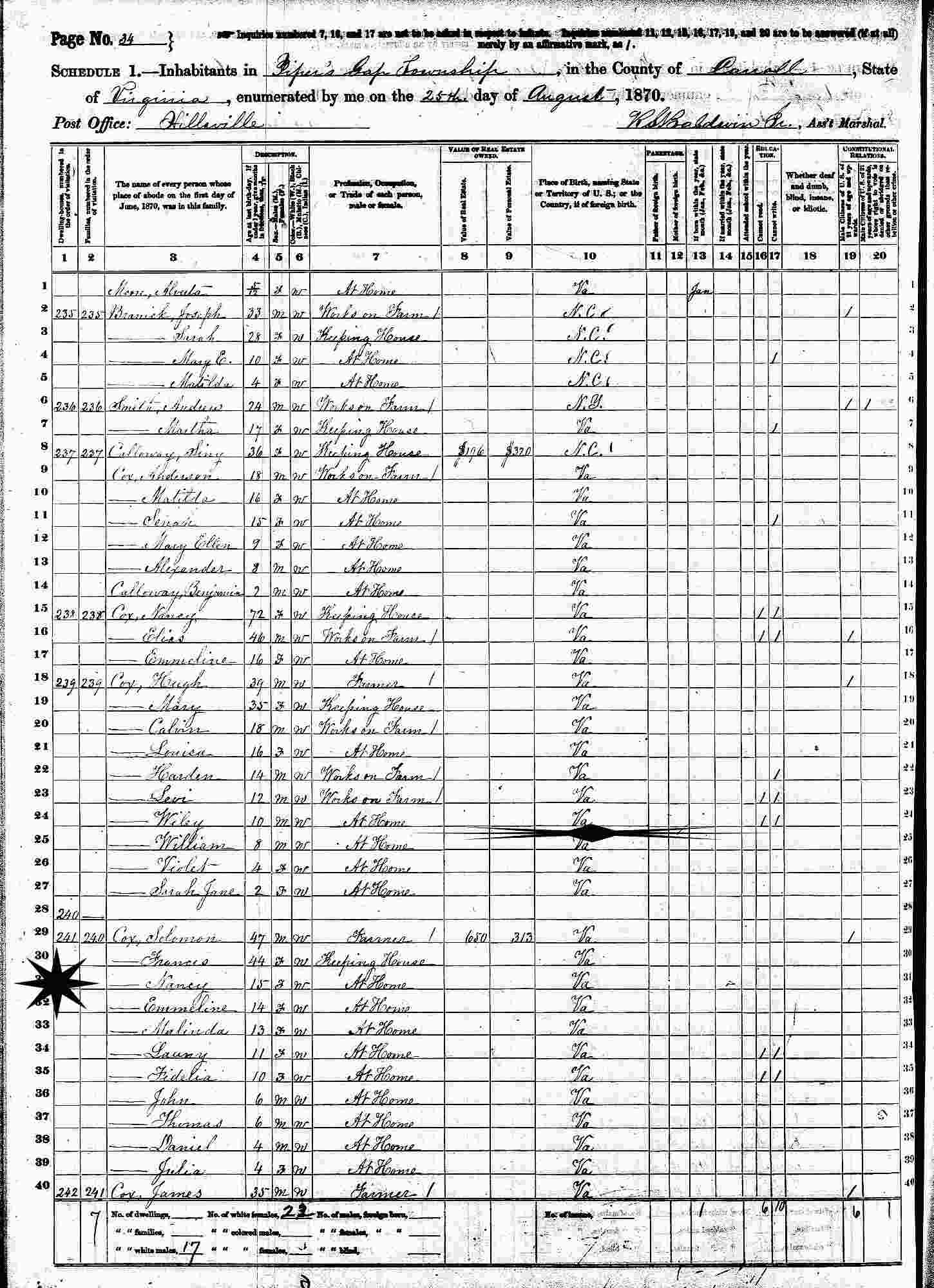August 25, 1870 - Pipers Gap Township, Hillsville Post Office, Carroll County, Virginia.