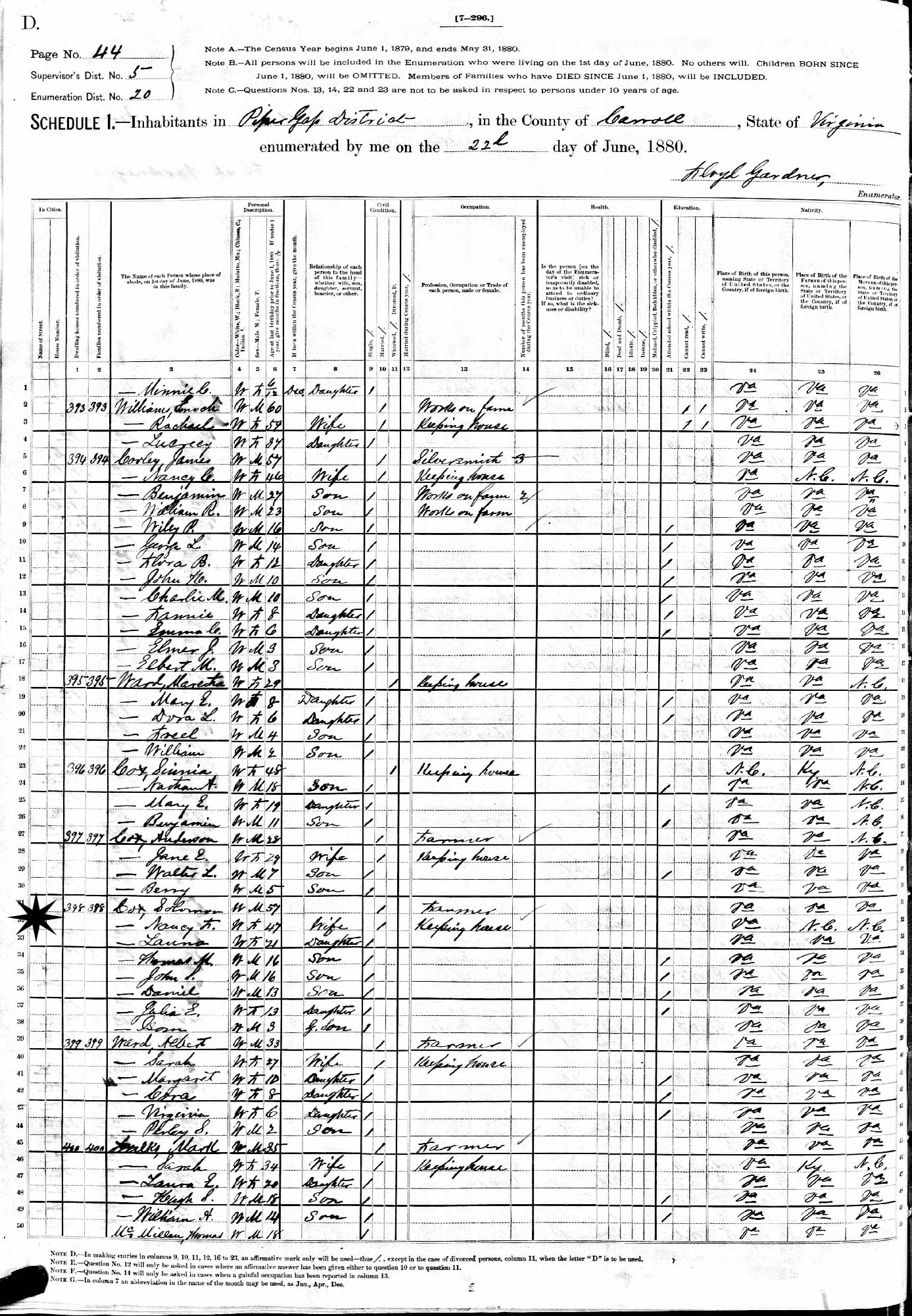 June 22, 1880 - Pipers Gap District, Supervisor's District 6, Enumeration District 20, Carroll County, Virginia.