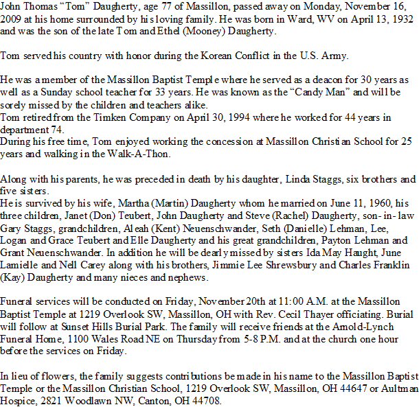 Died: November 16, 2009 in Massillon, Stark County, Ohio.