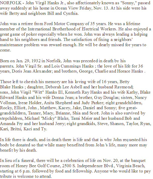 Son of John Virgil and Lois Irene (Cummings) Hanks, Sr.