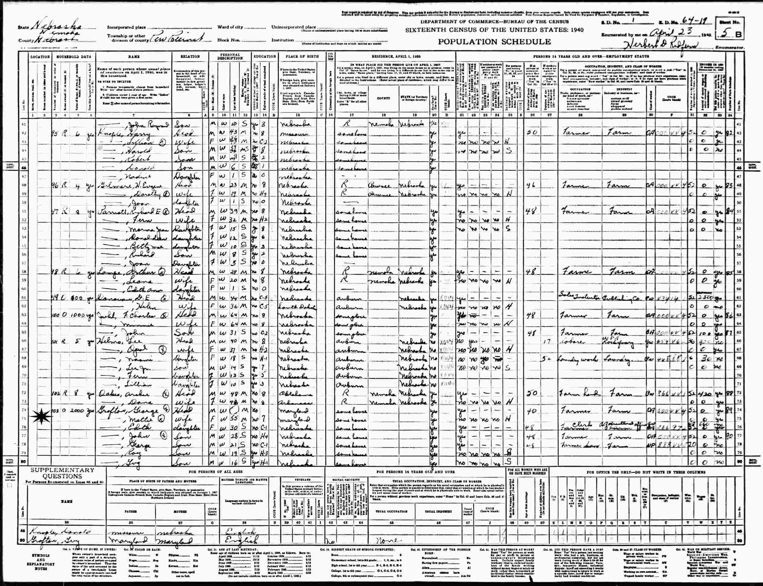 April 23, 1940 - Supervisor's District 1, Enumeration District 64-19, Peru Precinct, Nemaha County, Nebraska.