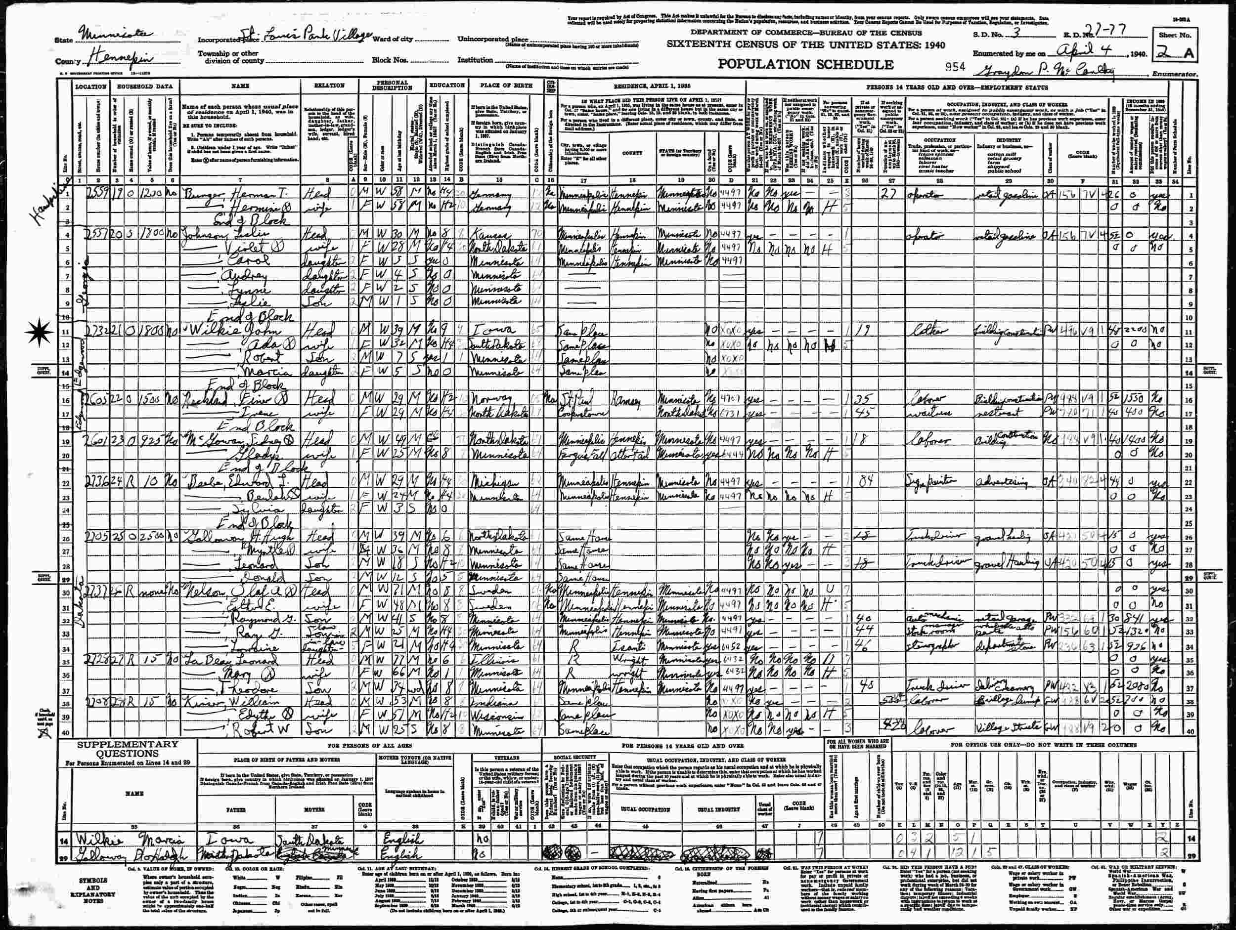 April 4, 1940 - 2732 Inglewood, St. Louis Park Village, Supervisor's District 3, Enumeration District 27-77, Hennepin, Minnesota.