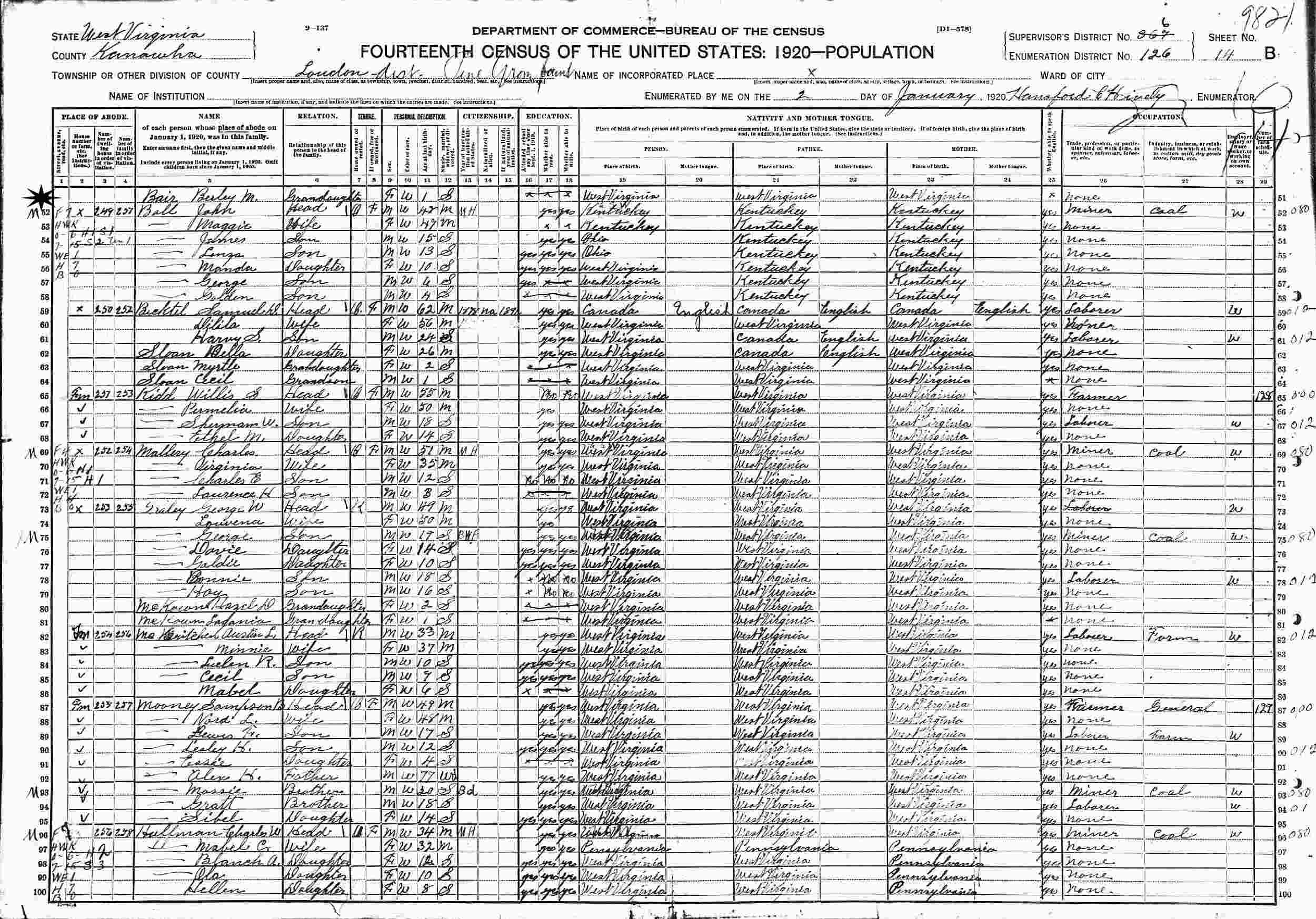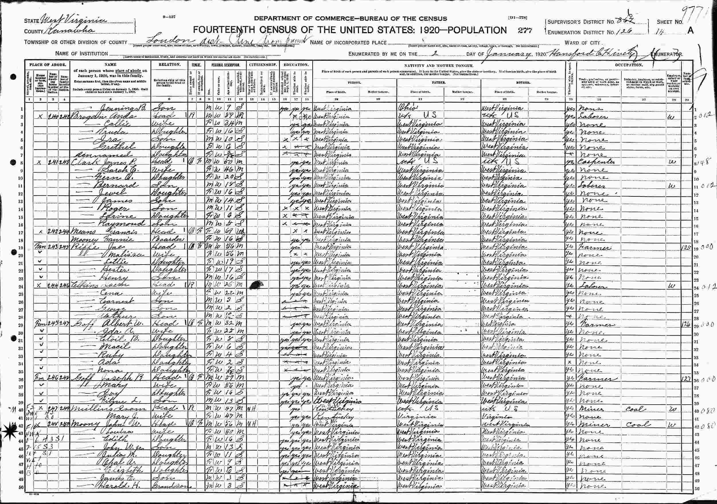 January 2, 1920 - Supervisor's District 367 (crossed out to 6), Enumeration District 126, Loudon District, Kanawha County, West Virginia.