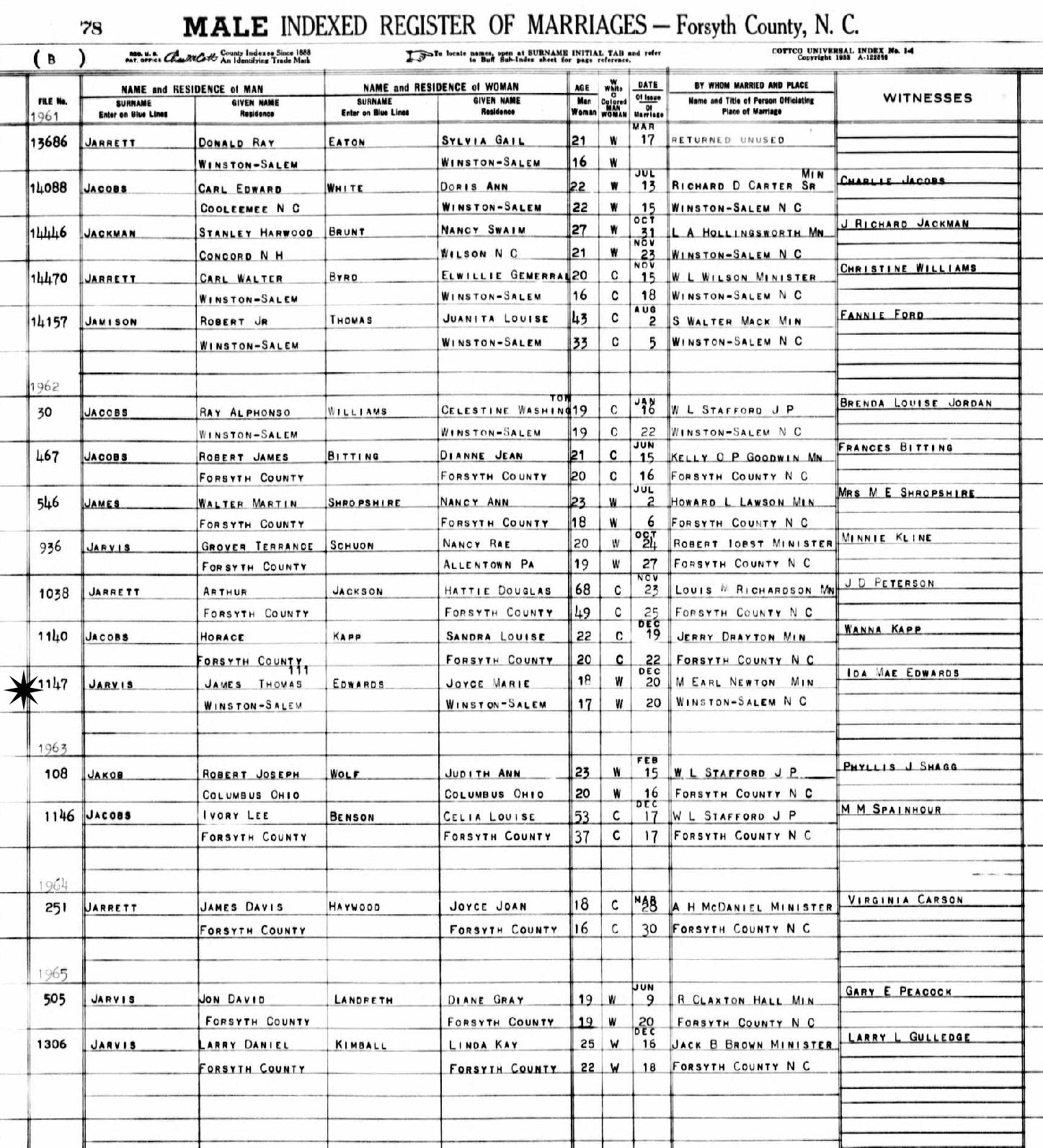 Married: James Thomas Jarvis, III December 20, 1963 in Winston-Salem, Forsyth County, North Carolina.