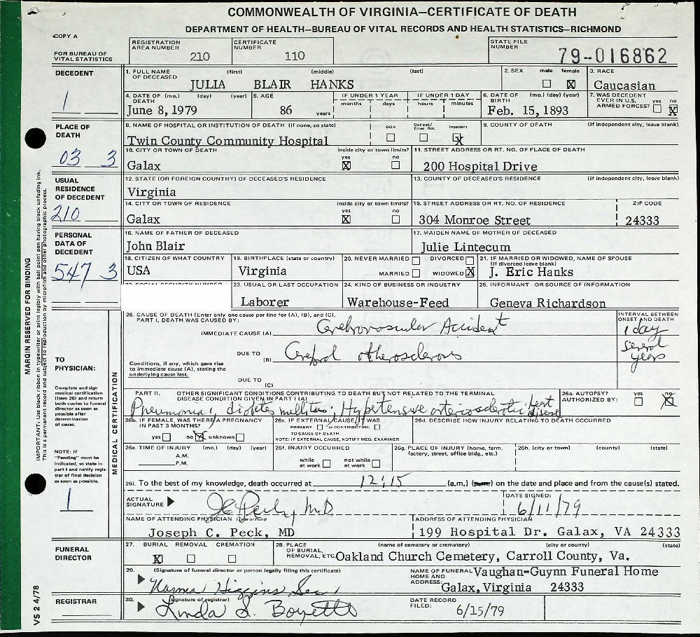 Died: June 8, 1979 in Galax City, Virginia.