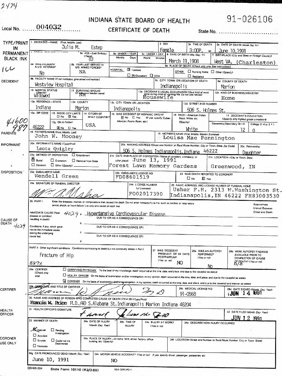 Died: June 10, 1991 in Indianapolis, Marion County, Indiana.