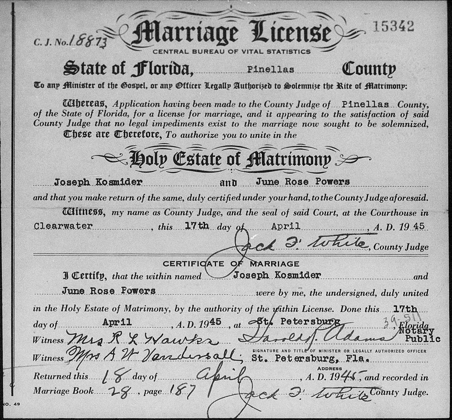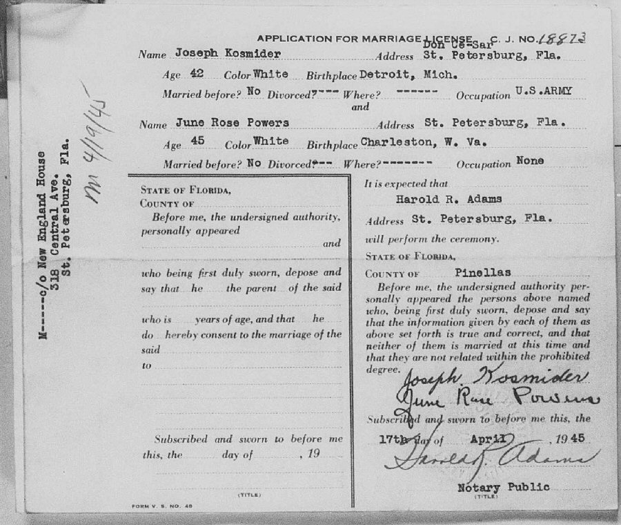 Married: Joseph Kosmider after April 17, 1945 in Pinellas County, Florida.