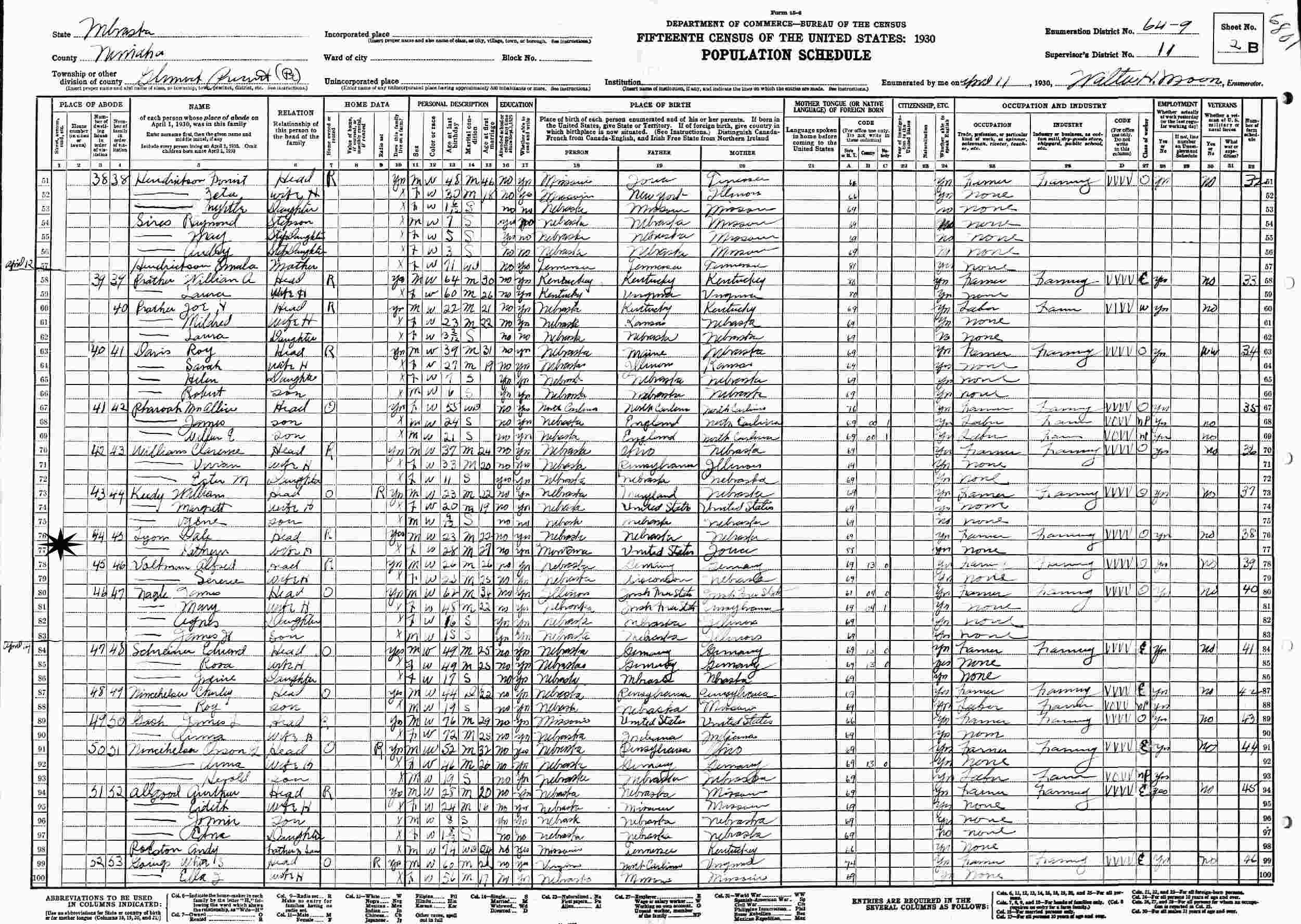 April 12, 1930 - Supervisor's District 11, Enumeration District 64-9, Glen Rock, Nemaha County, Nebraska.