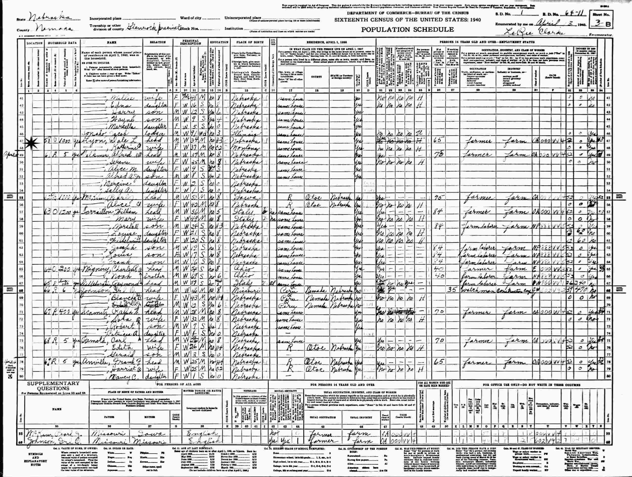 April 14, 1940 - Supervisor's District 1, Enumeration District 64-11, Glen Rock, Nemaha County, Nebraska.