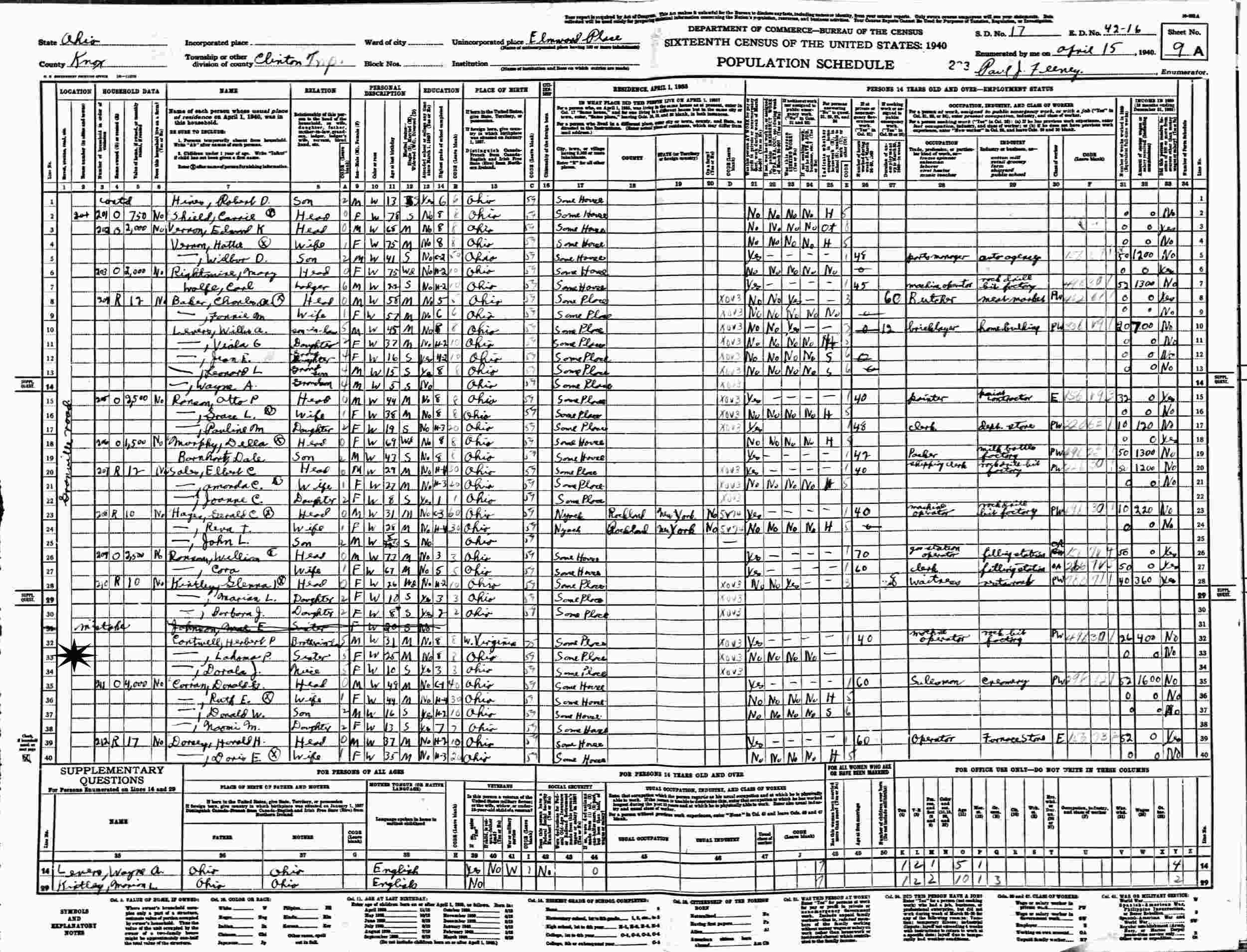 April 15, 1940 - Greenville Road, Supervisor's District 17, Enumeration District 42-16, Clinton Township, Elmwood Place, Knox County, Ohio.