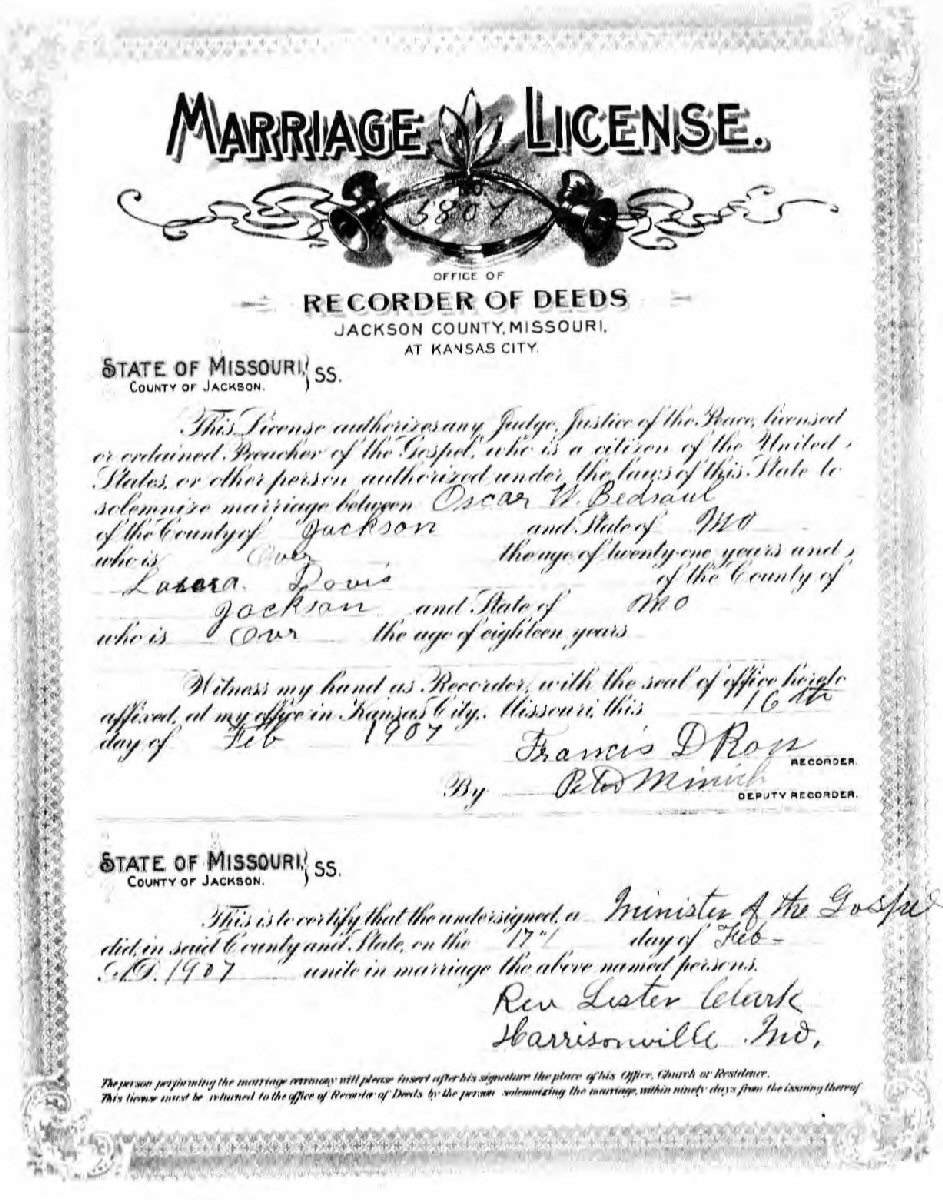 Married: William Oscar Bedsaul February 17, 1907 in Kansas City, Jackson County, Missouri.