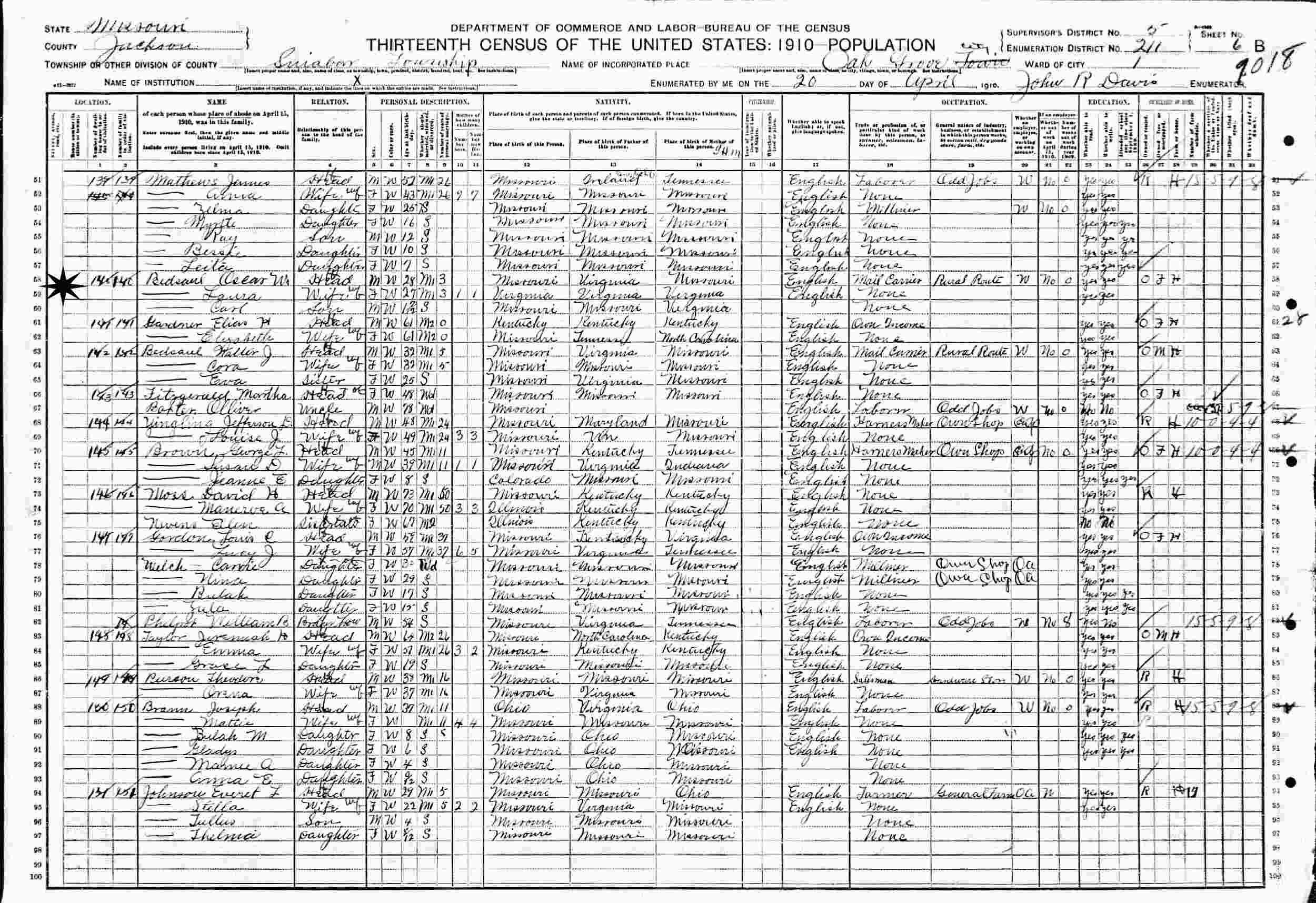 April 20, 1910 - Sniabar Township, Ward 1, Supervisor's District 5, Enumeration District 211, Oak Grove City, Jackson County, Missouri.