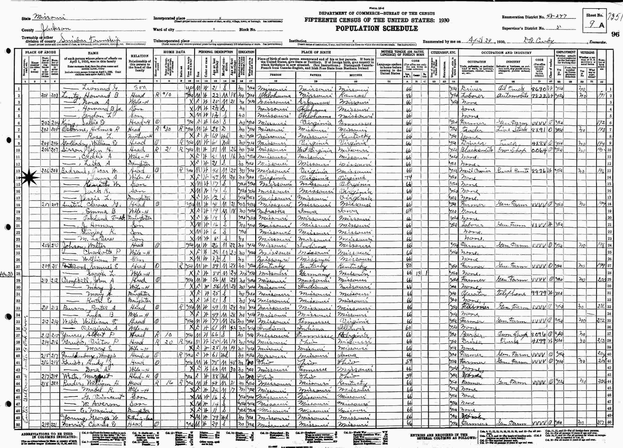 April 29, 1930 - Sniabar Township, Supervisor's District 5, Enumeration District 48-277, Jackson County, Missouri.