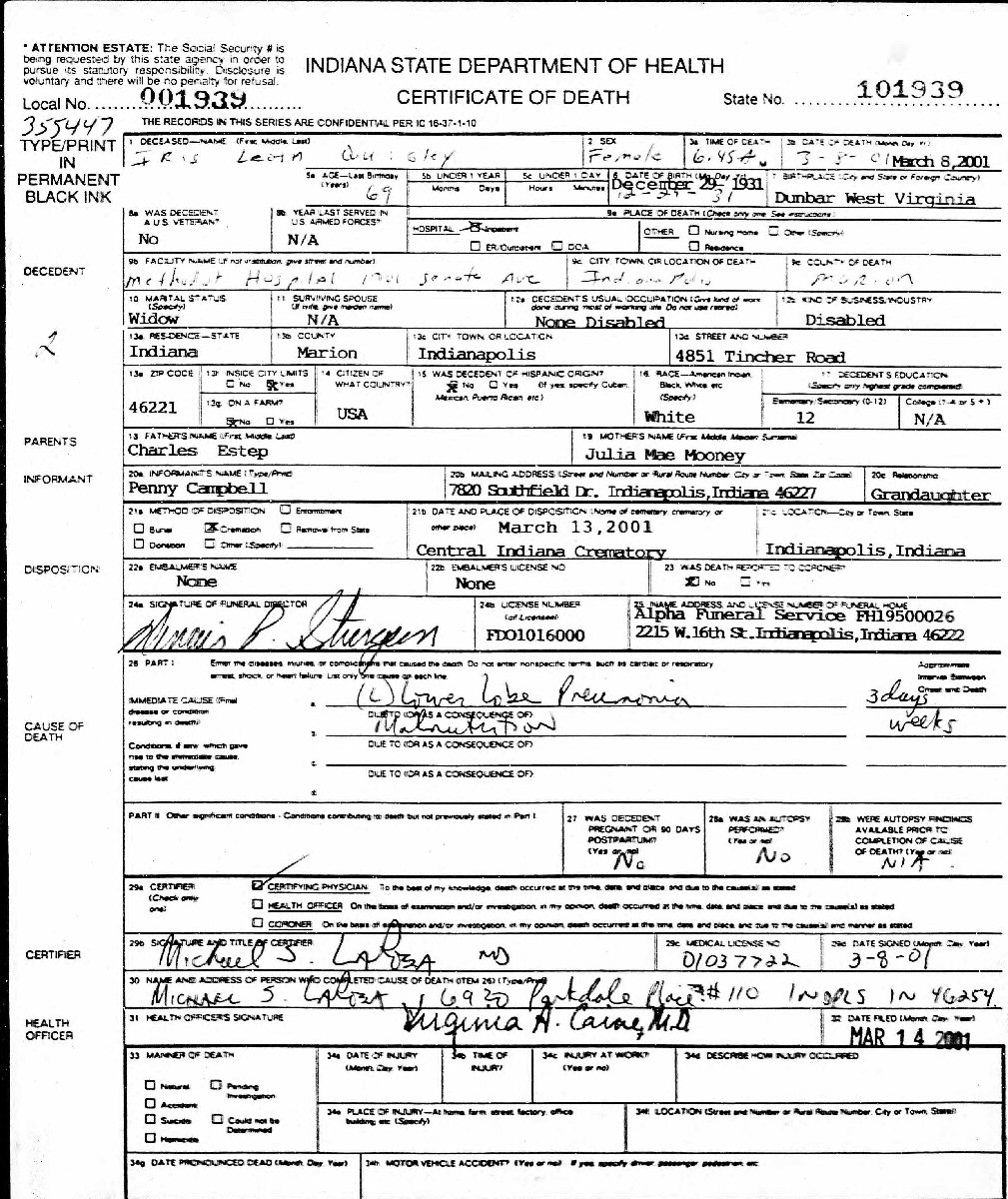 Died: March 8, 2001 in Methodist Hospital, Greenwood, Johnson County, Indiana.