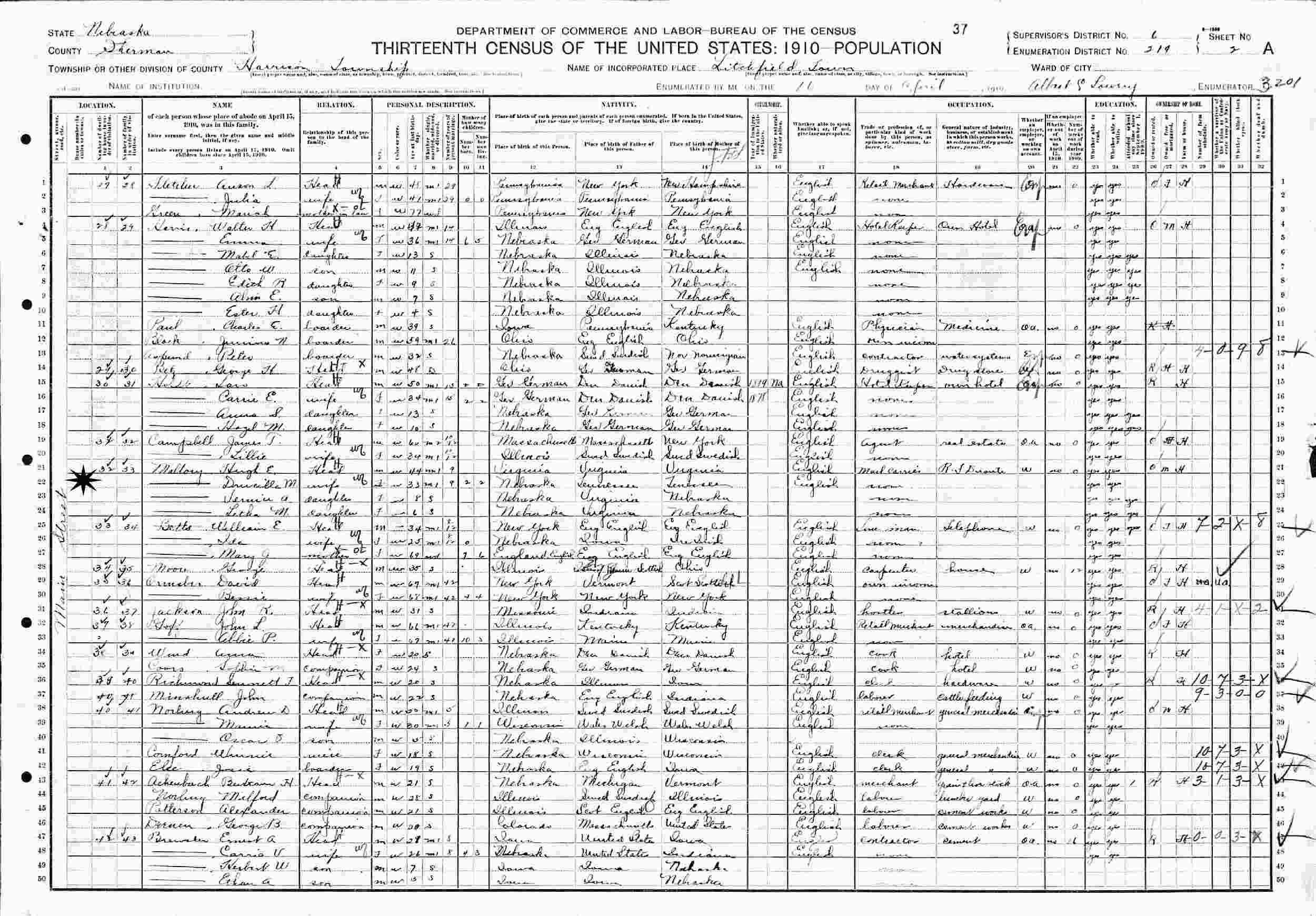 April 10, 1910 - Main Street, Supervisor's District 6, Enumeration District 219, Harrison Township, Litchfield Town, Sherman County, Nebraska.