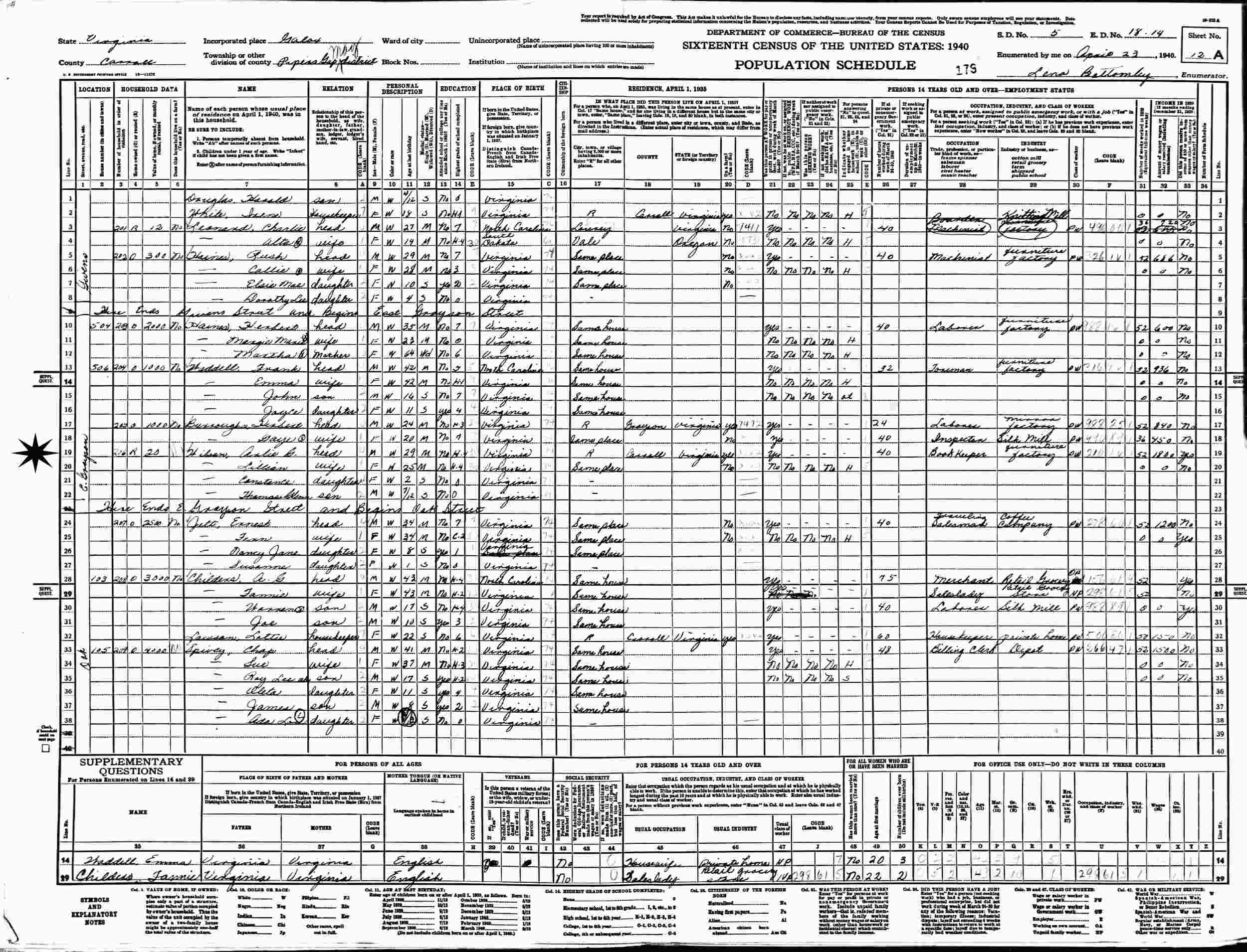 April 22, 1940 - E Grayson, Supervisor's District 6, Enumeration District 18-14, Pipers Gap Magisterial District, Galax, Carroll County, Virginia.