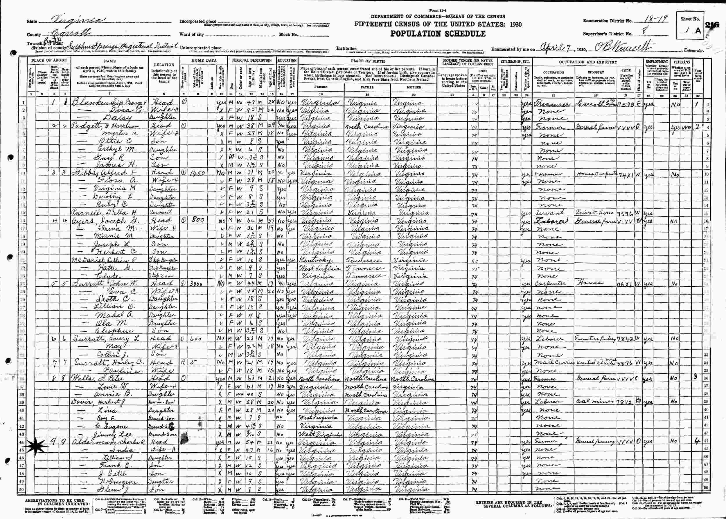 April 7, 1930 - Supervisor's District 8, Enumeration District 18-19, Sulphur Springs Magisterial District, Carroll County, Virginia.