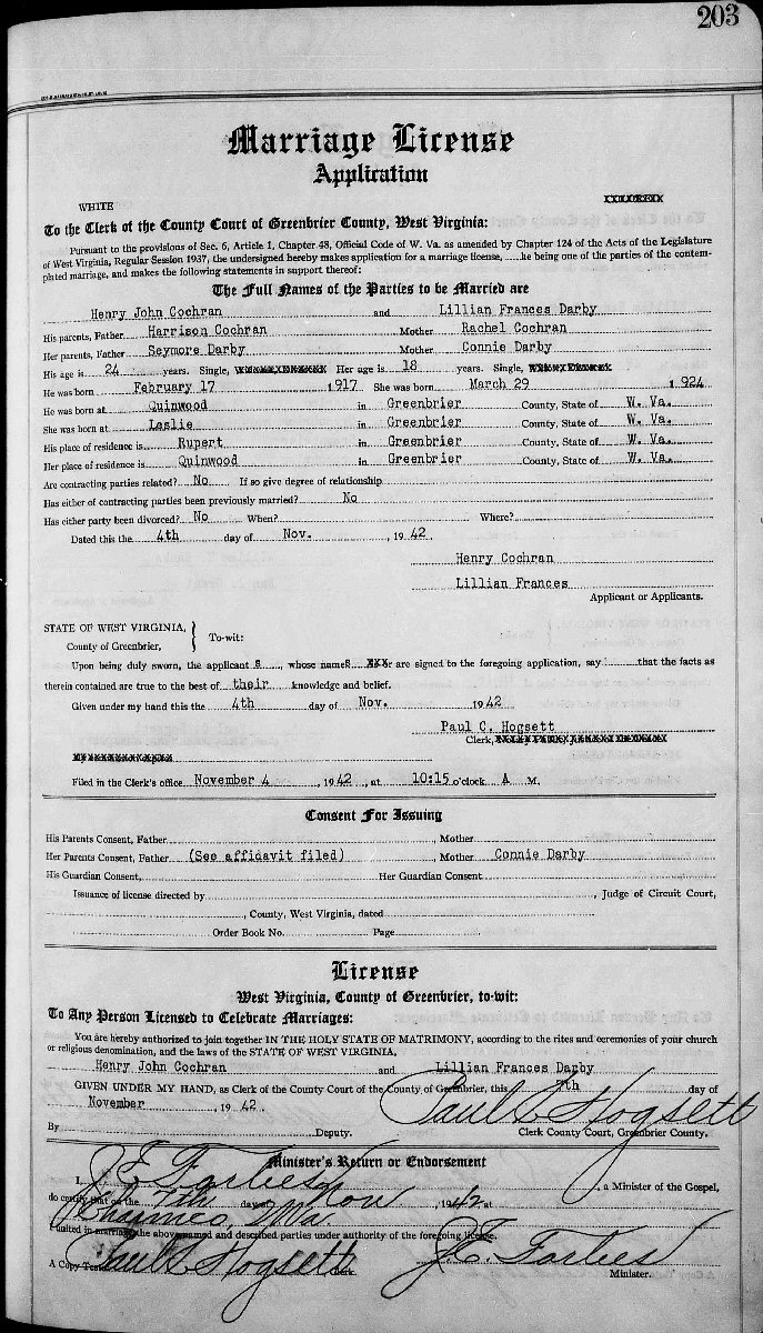 Married: (1) Henry John Cochran 1942 in Greenbrier County, West Virginia.