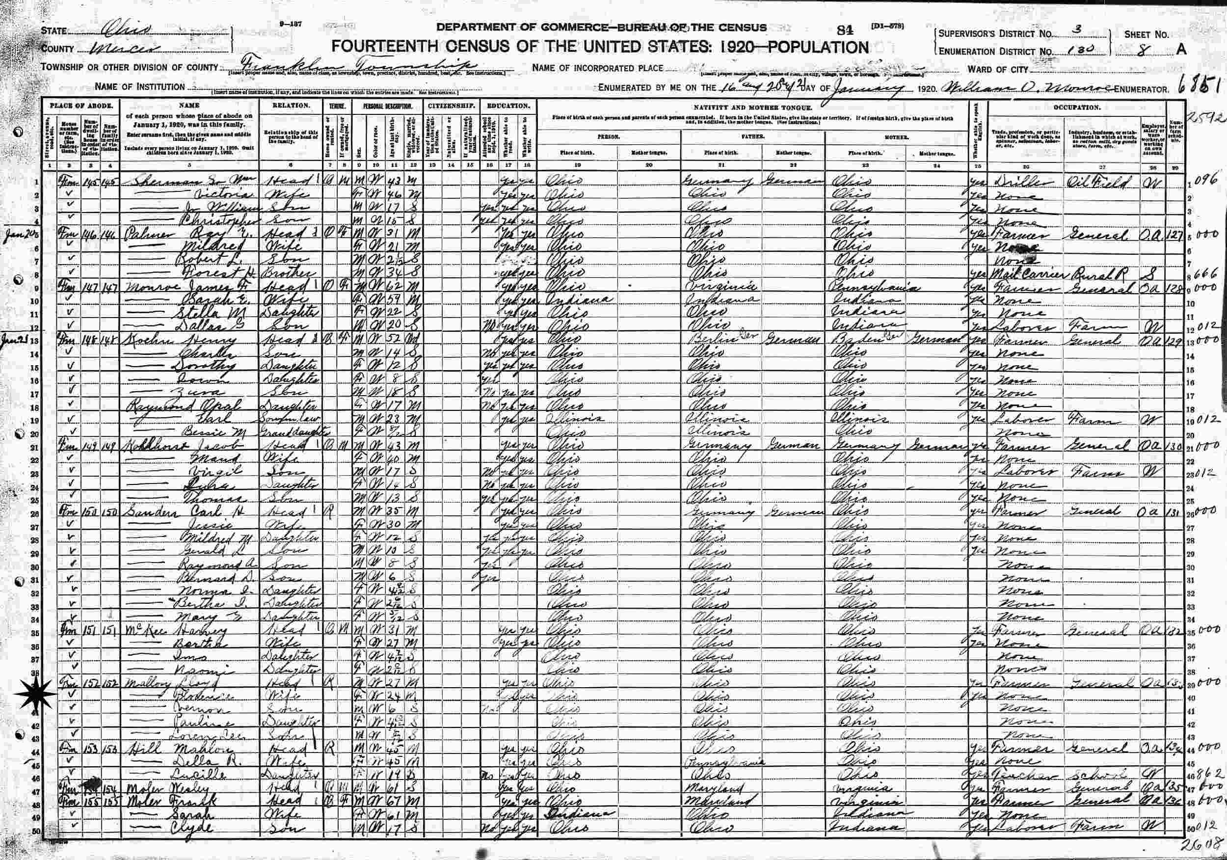 January 16-20, 1920 - Supervisor's District 3, Enumeration District 180, Franklin Township, Mercer County, Ohio.