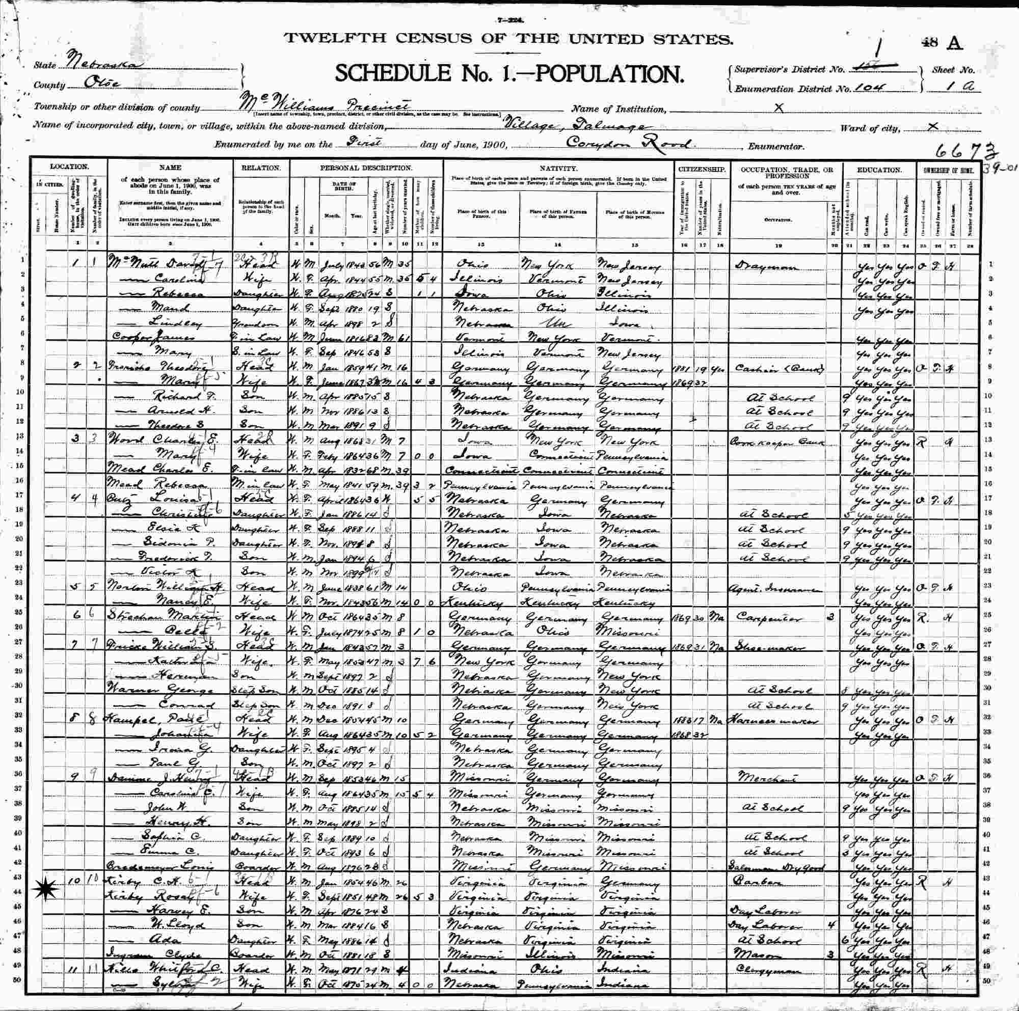 June 1, 1900 - Supervisor's District 156 (crossed out to 1), Enumeration District 104, McWilliams Precinct, Talwage Village, Otoe County, Nebraska.