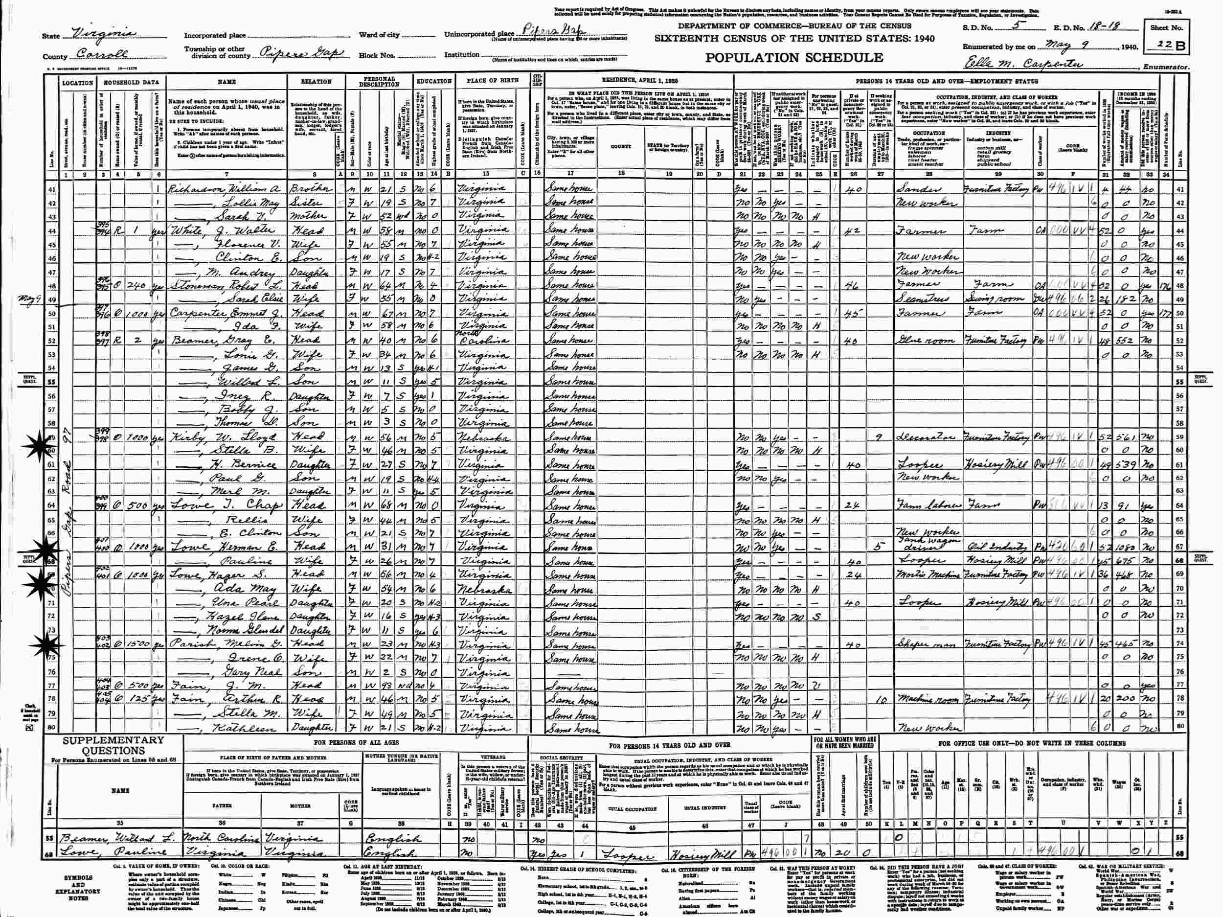 May 9, 1940 - Supervisor's District 5, Enumeration District 18-18, Pipers Gap, Carroll County, Virginia.