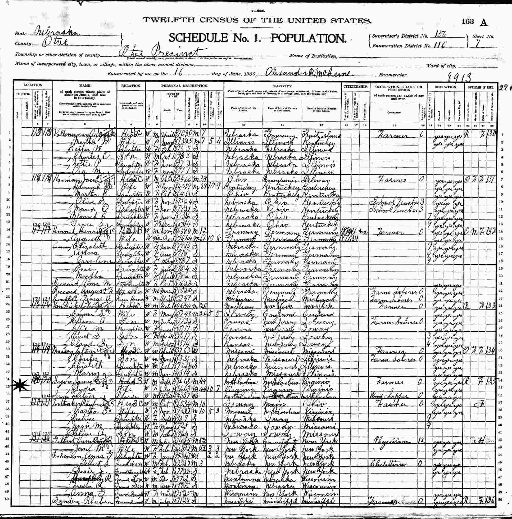 June 16, 1900 - Supervisor's District 156, Enumeration District 116, Otoe, Otoe Precinct, Nebraska.
