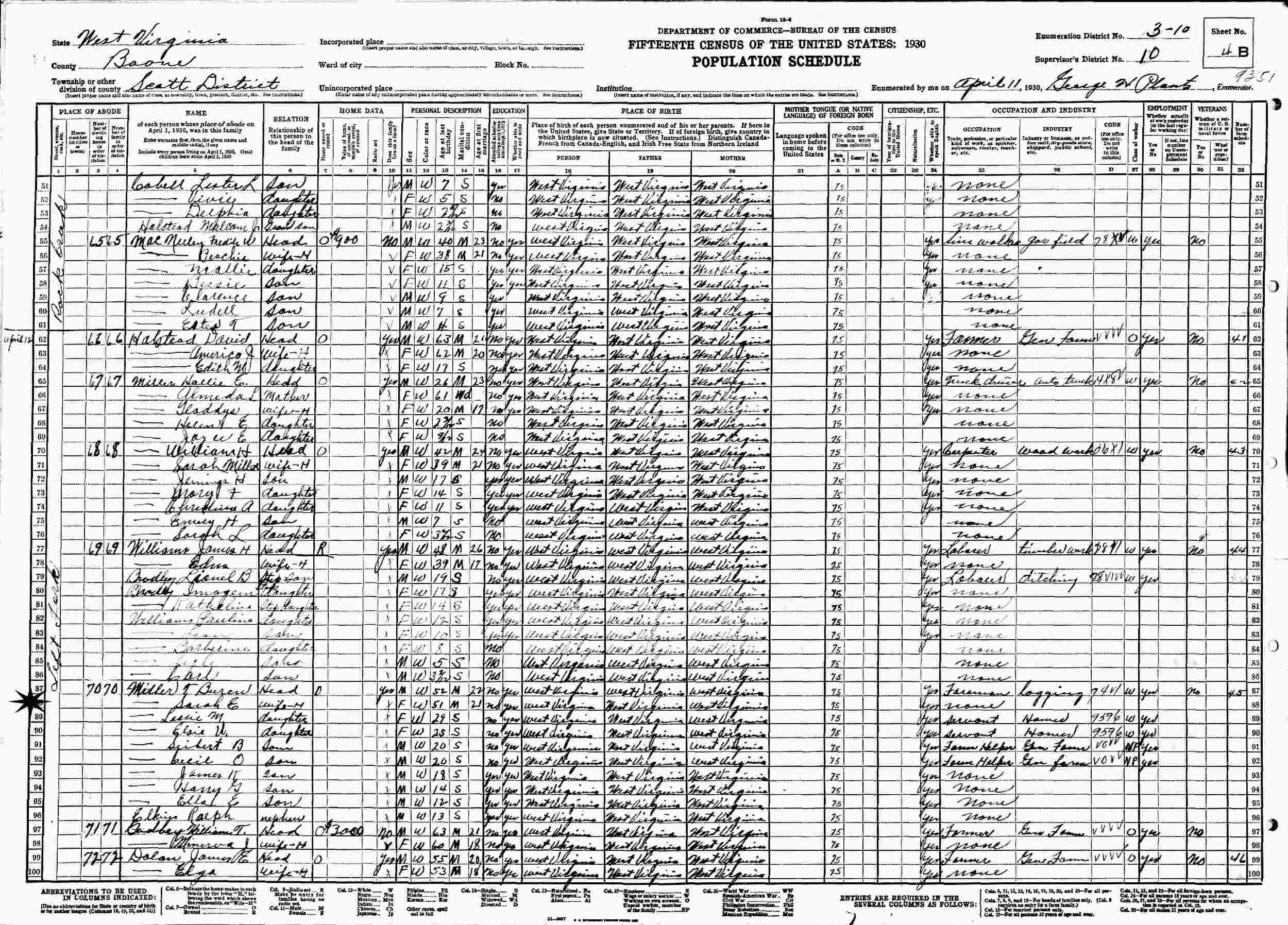 January 10, 1920 - Williams Fork of Rock Creek, Precinct 3, Supervisor's District 367 (crossed out to 6), Enumeration District 4, Scott District, Boone County, West Virginia.