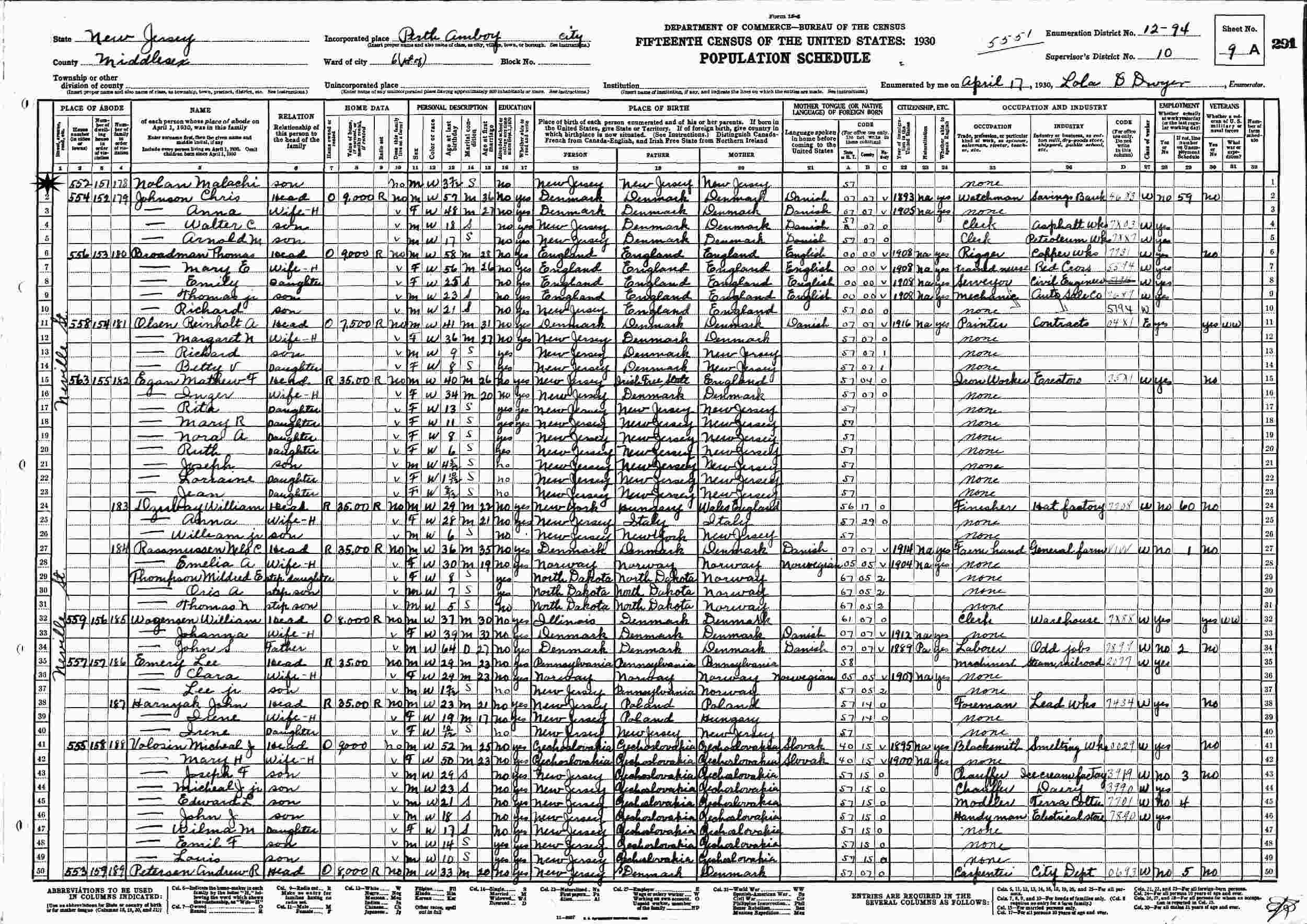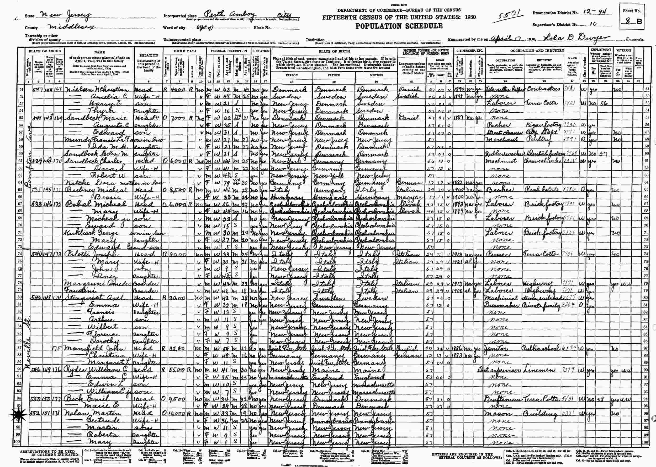 April 17, 1930 - 552 Neville Street, Ward 6, Supervisor's District 10, Enumeration District 12-94, Perth Amboy, Middlesex County, New Jersey.