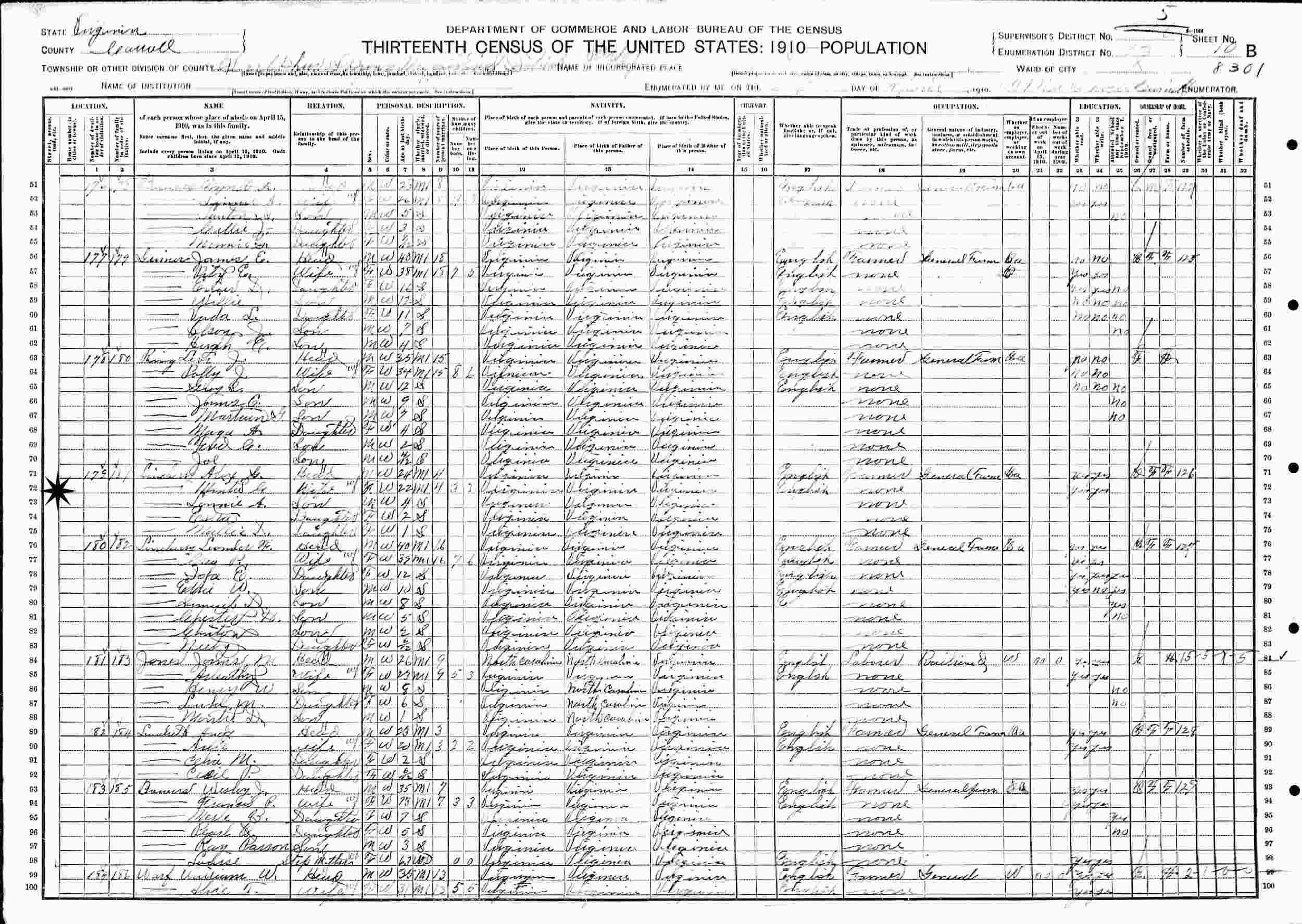 April, 1910 - Sulphur Springs Magisterial District, Supervisor's District 5, Enumeration District 13, Carroll County, Virginia.