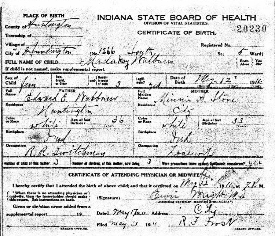 Born: May 12, 1911 in Huntington, Huntington County, Indiana.
