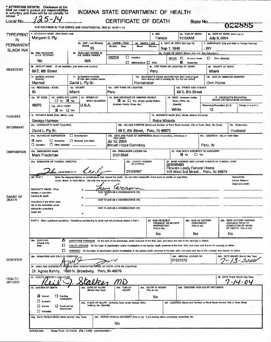 (2) David Lee Ply, Sr. March 29, 2004 in Peru, Miami County, Indiana.