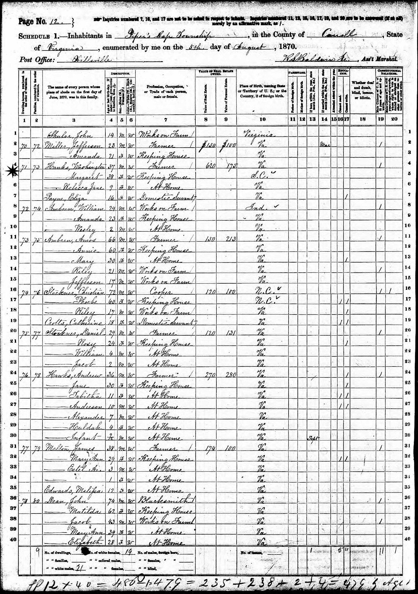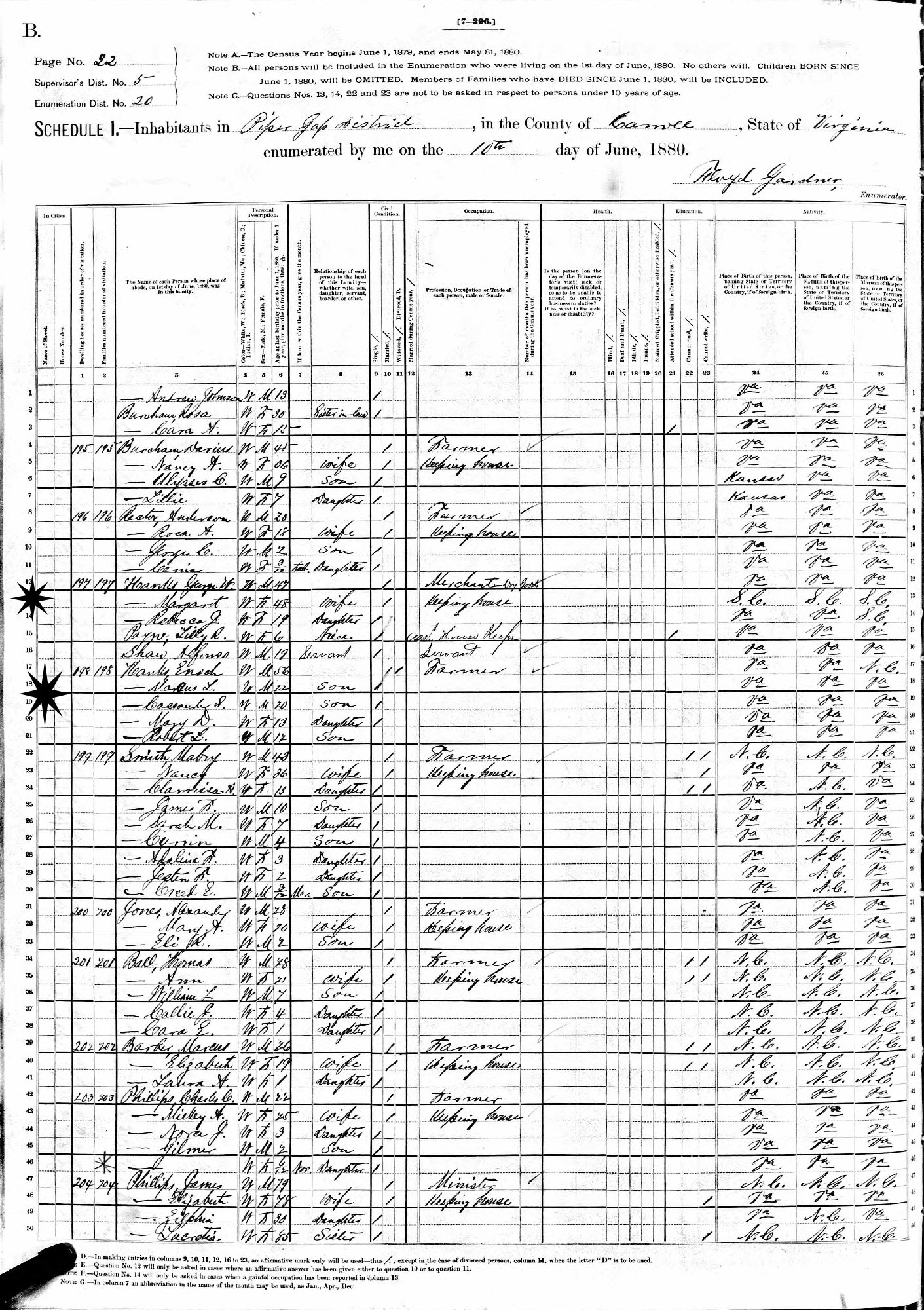 June 10, 1880 - Supervisor's District 6, Enumeration District 20, Pipers Gap, Carroll County, Virginia.
