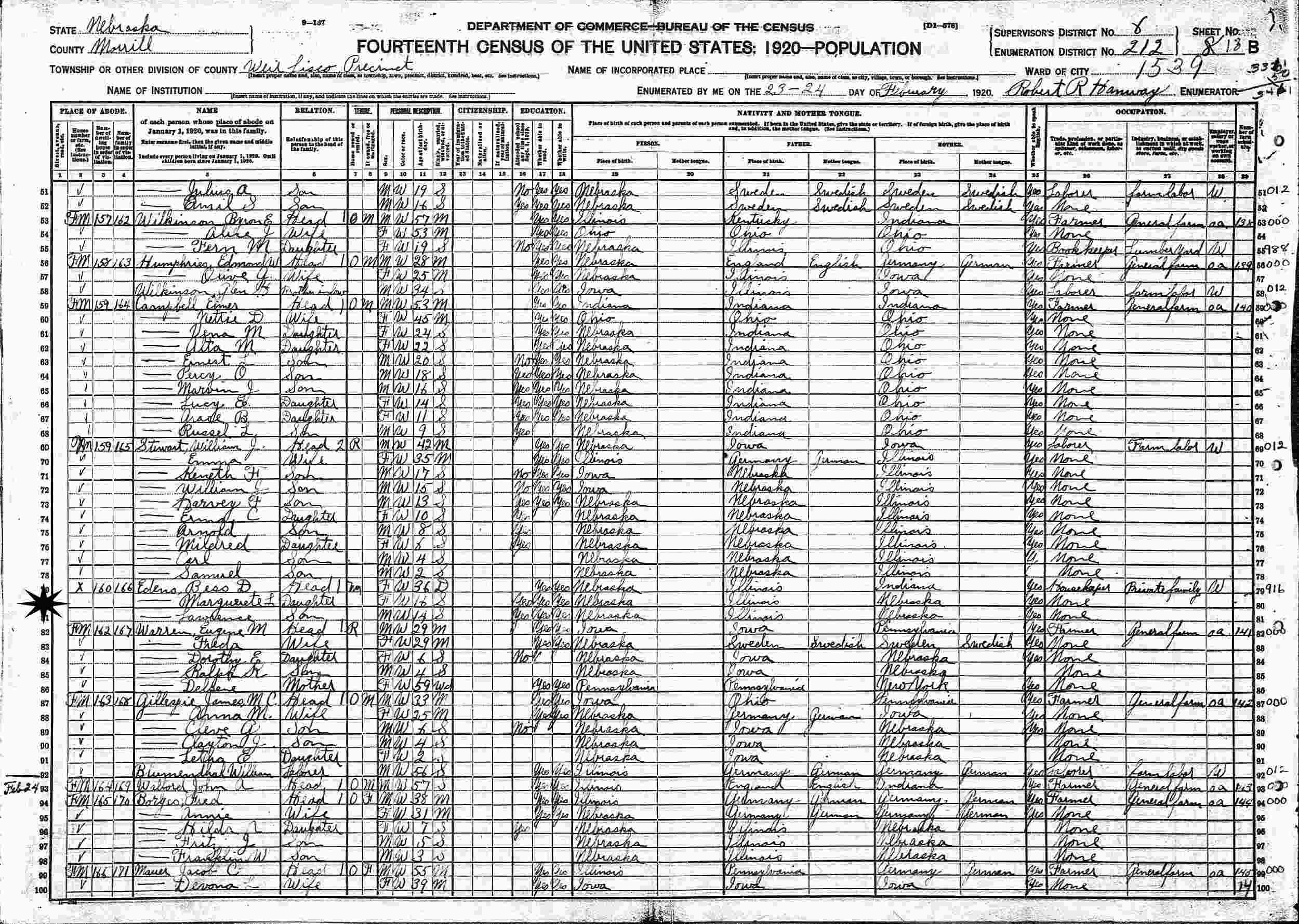 February 23-24, 1920 - Supervisor's District 8, Enumeration District 212, Weil Lisco Precinct, Morrill County, Nebraska.