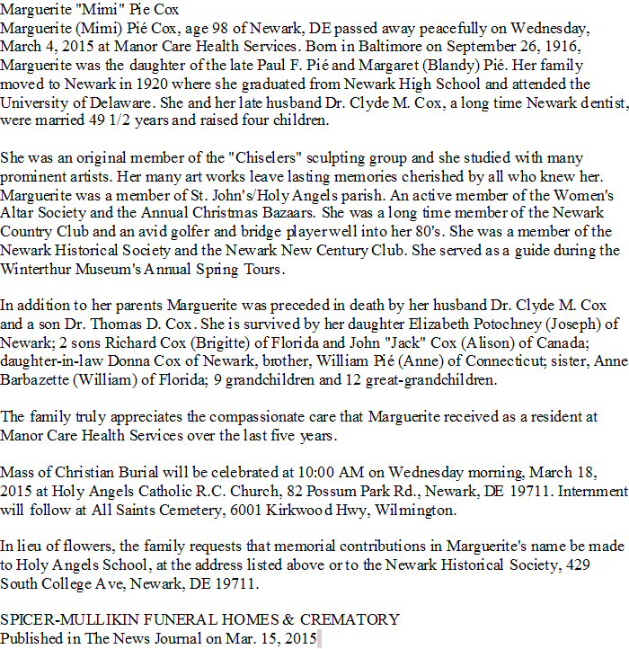 Died: March 4, 2015 in Manor Care Health Services, Newark, New Castle County, Delaware.