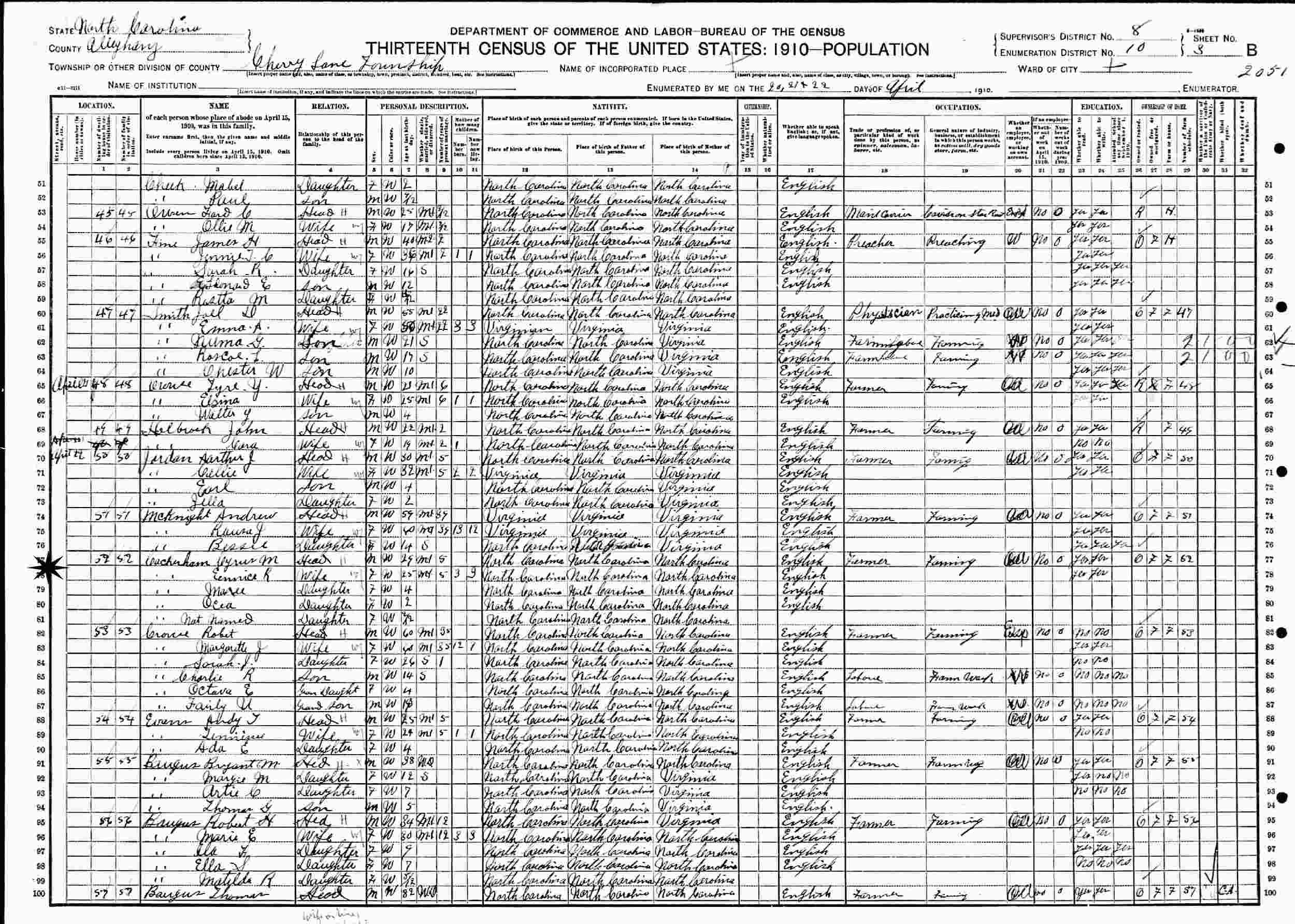 April 22, 1910 - Cherry Lane Township, Supervisor's District 8, Enumeration District 10, Alleghany County, North Carolina.