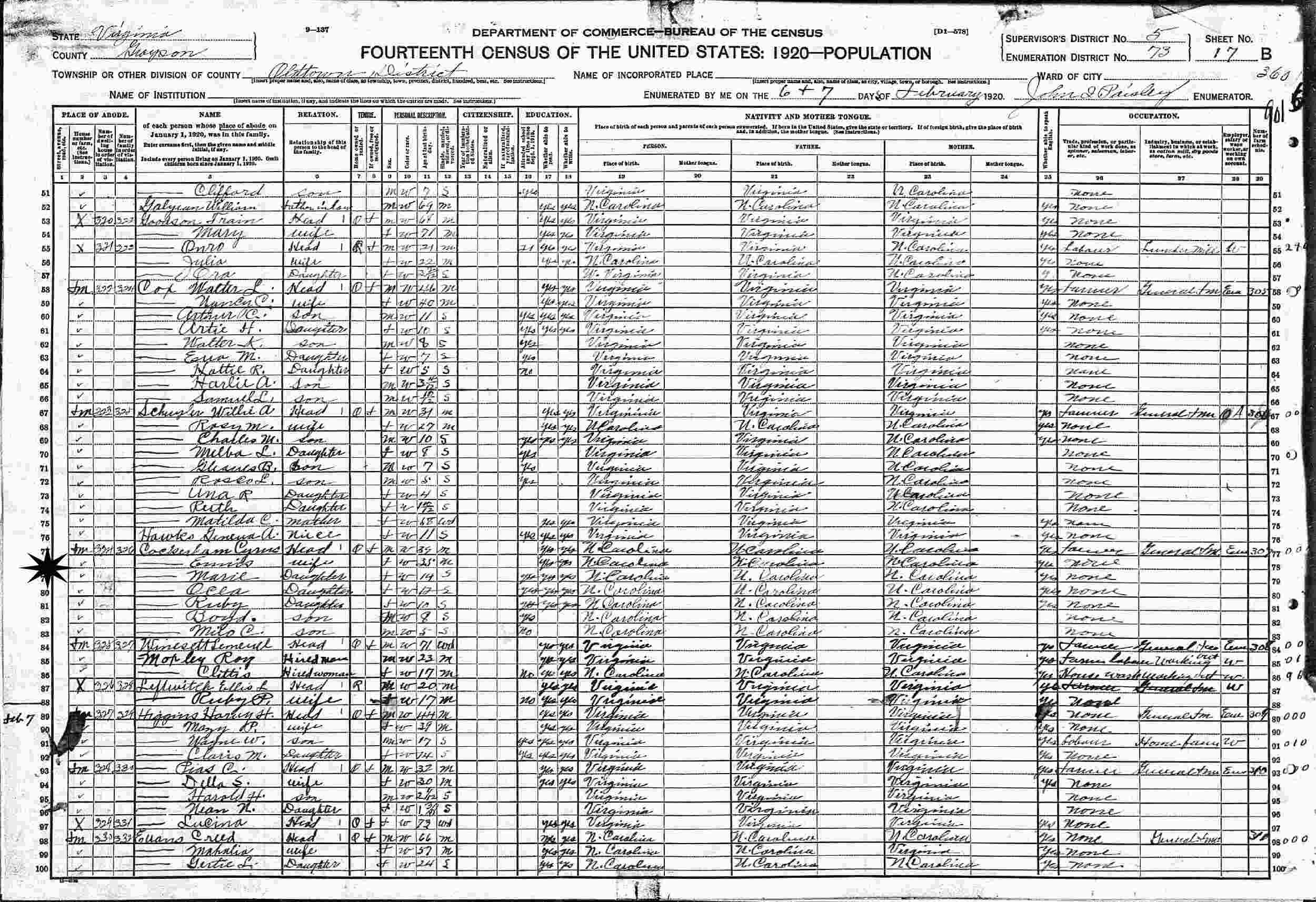 February 6-7, 1920 - Oldtown District, Supervisor's District 5, Enumeration District 73, Grayson County, Virginia.