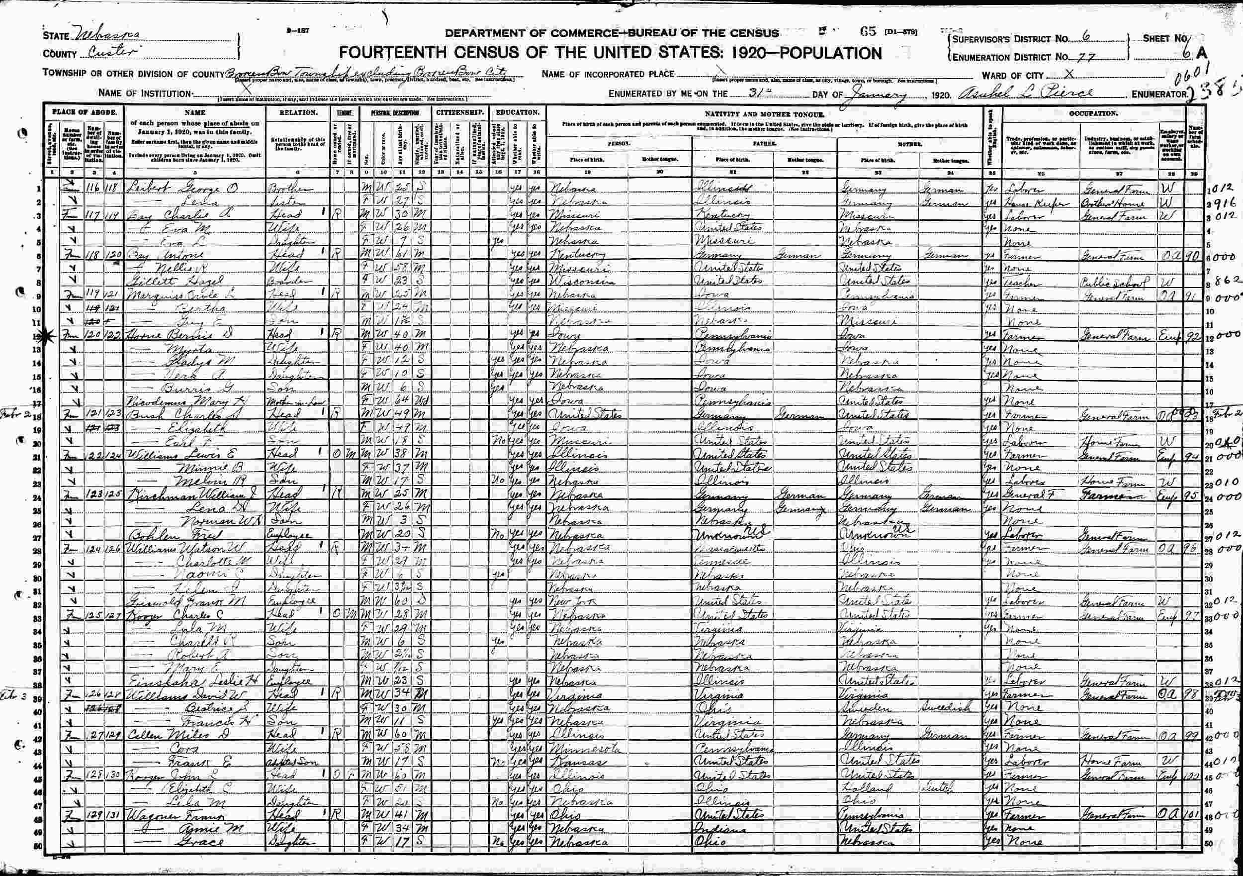 January 31, 1920 - Supervisor's District 6, Enumeration District 77, Broken Bow Township, Custer County, Nebraska.