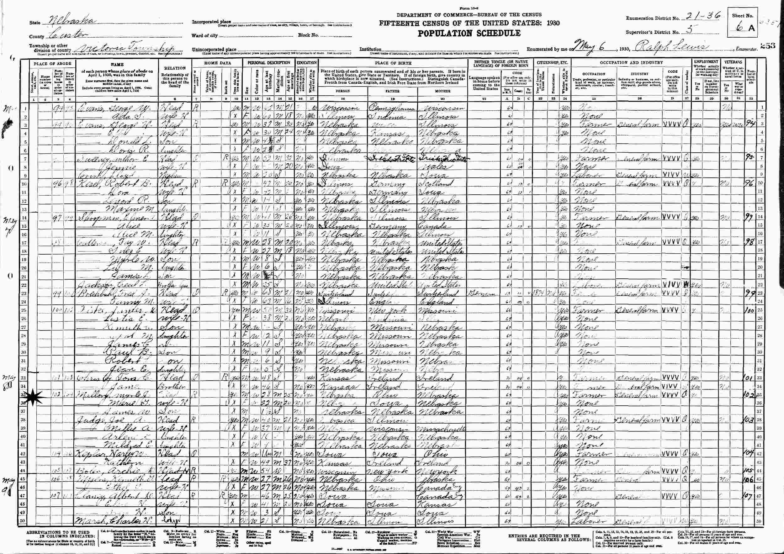 May 6-9, 1930 - Supervisor's District 5, Enumeration 21-36, Victoria Township, Custer County, Nebraska.