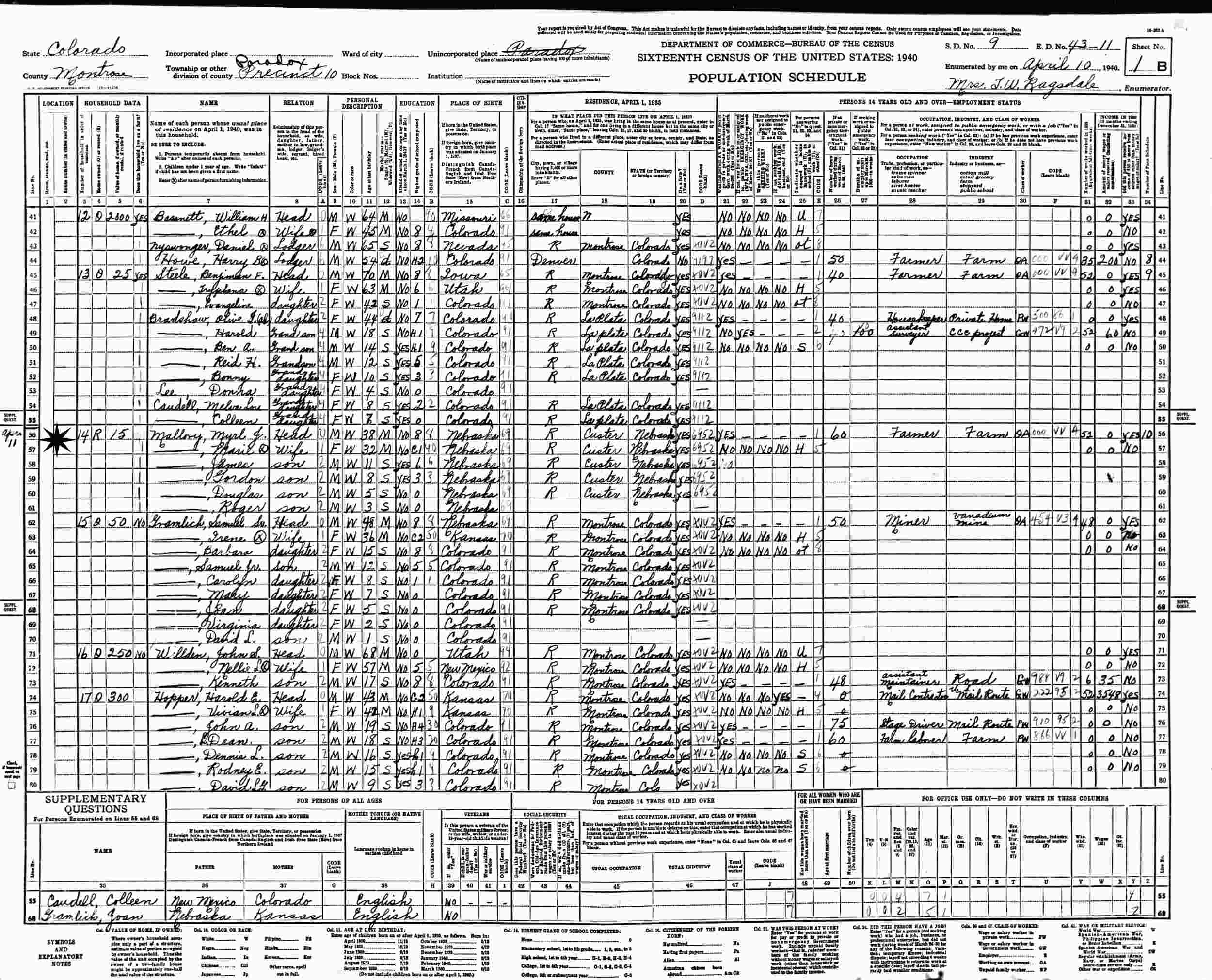 April 10-11, 1940 - Precinct 10, Supervisor's District 9, Enumeration District 43-11, Paradox, Montrose County, Colorado.