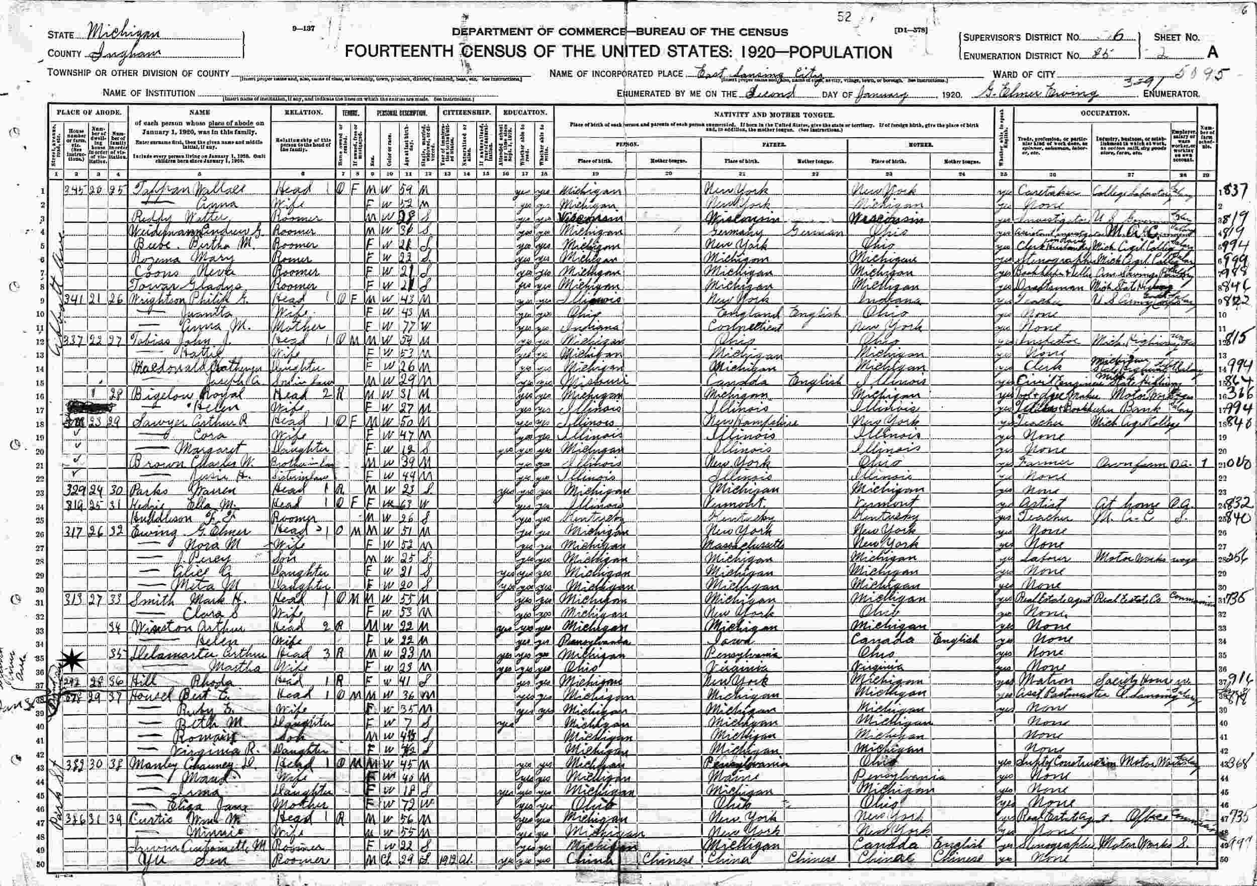 January 2, 1920 - 313 Abbott Avenue, Supervisor's District 5, Enumeration District 85, East Lansing, Ingham County, Michigan.