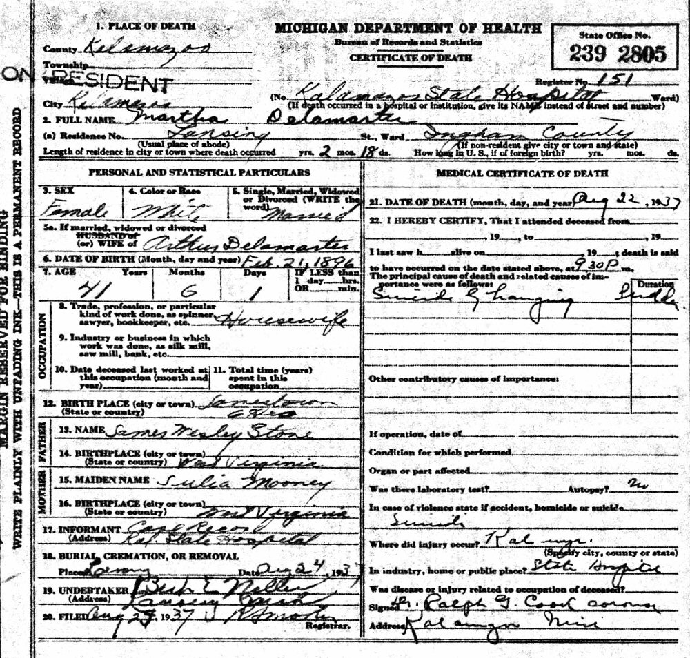 Died: August 22, 1937 in Kalamazoo, Kalamazoo County, Michigan.