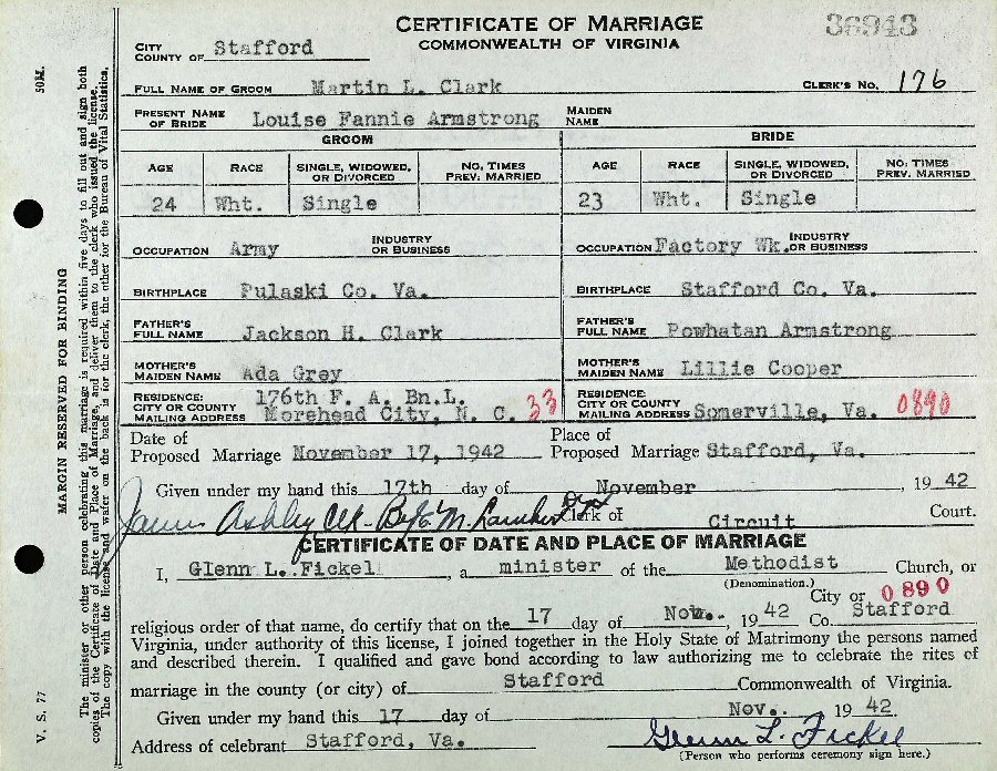 Married: Louise Fannie Armstrong November 17, 1942 in Stafford County, Virginia.